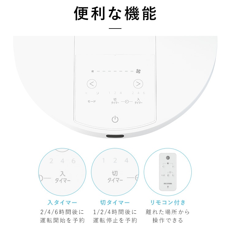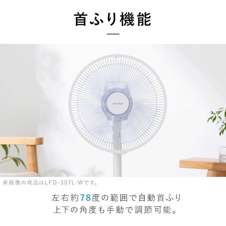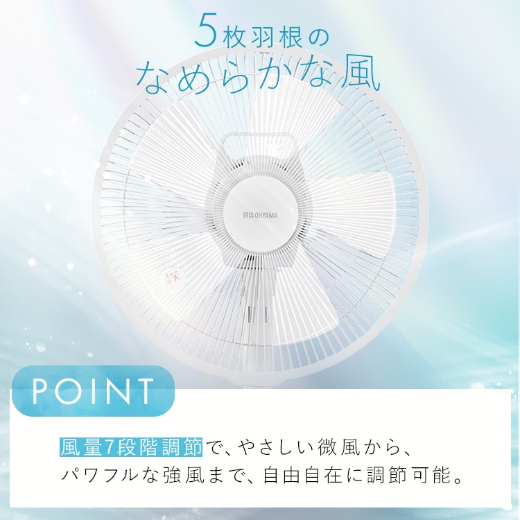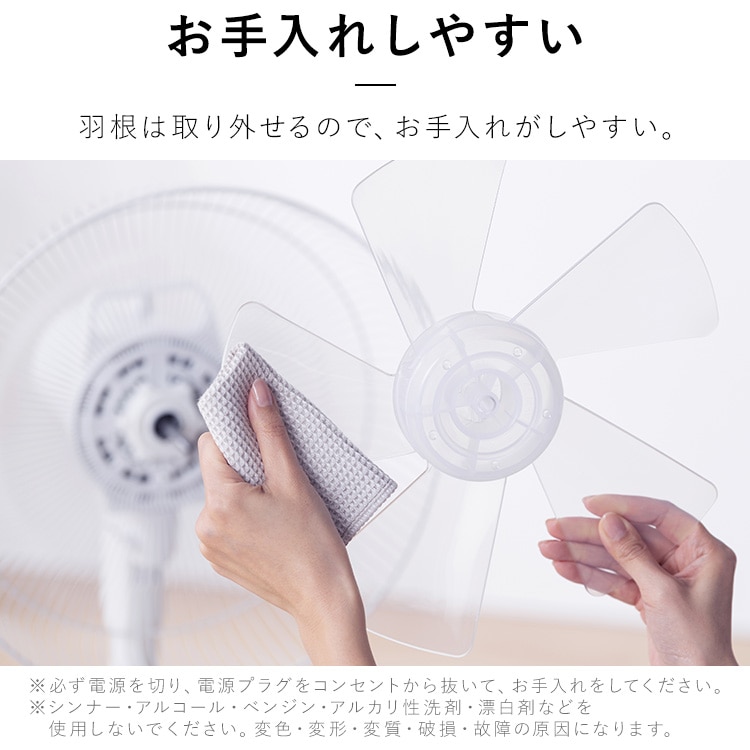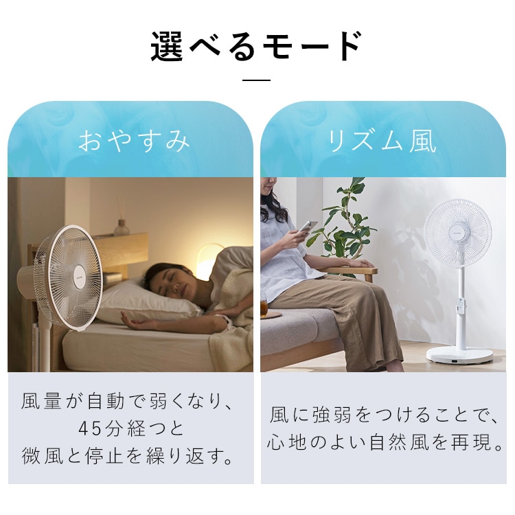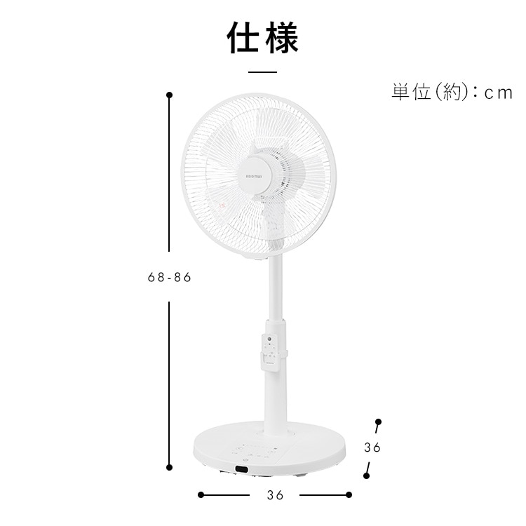 【商品説明】DCモーター搭載で省エネ・静音のリビング扇風機です。DCモーター/5枚羽根/風量7段階◆5枚羽根のなめらかな風羽根の枚数を増やすことで空気を細かく分け、なめらかな風を作り出す。 3枚羽根:空気を大きな塊で送る→肌への圧力を感じる風に 5枚羽根:空気を細かく分けて送る→繊細でなめらかな風に◆風量7段階調節やさしい微風から、パワフルな強風まで、自由自在に調節可能。◆首振り機能[左右首振り]自動:左右78±5度手動:左右34度[上下首振り]手動:下16度/上20度◆選べるモードおやすみモード:風量が自動で弱くなり、45分経つと微風と停止を繰り返す。リズム風モード:風に強弱をつけることで、心地のよい自然風を再現。◆お手入れしやすい羽根は取り外せるので、お手入れがしやすい。※必ず電源を切り、電源プラグをコンセントから抜いて、お手入れをしてください。※お手入れに、シンナー・アルコール・ベンジン・アルカリ性洗剤・漂白剤などを使用しないでください。変色・変形・変質・破損・故障の原因になります。◆便利な機能[入タイマー]2/4/6時間後に運転を開始[切タイマー]1/2/4時間後に運転を停止[リモコン付き]離れた場所から操作できる【商品仕様】●電源AC100V 50Hz/60Hz●定格消費電力15W●商品サイズ(cm)幅約36×奥行約36×高さ約68~86(電源コード含まず)●商品重量約2.9kg(電源コード含む)●電源コード長さ約1.5m●風量7段階●首ふり左右(自動・手動)上下(手動)●モードリズム/おやすみ●タイマー入タイマー:2/4/6時間後に運転を開始切タイマー:1/2/4時間後に運転を停止●付属品リモコン