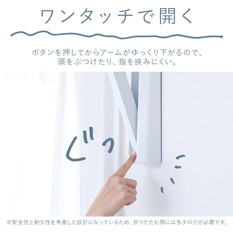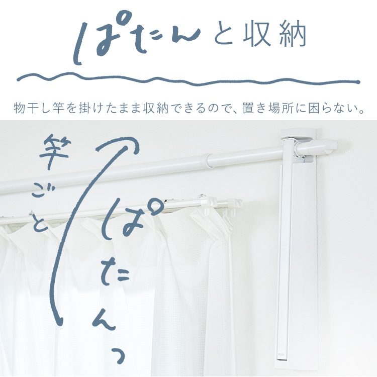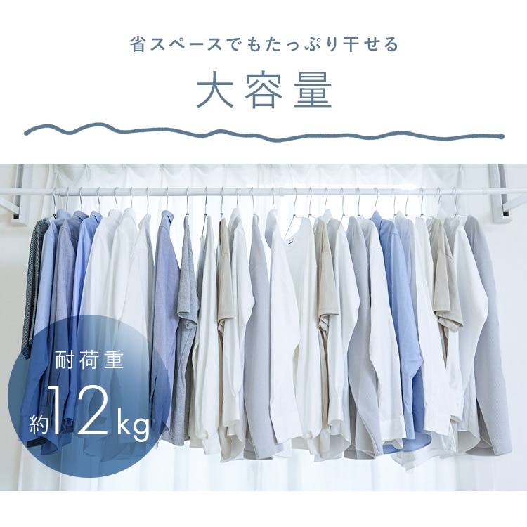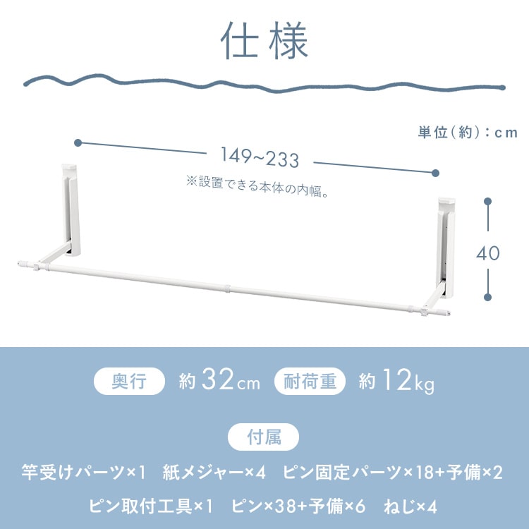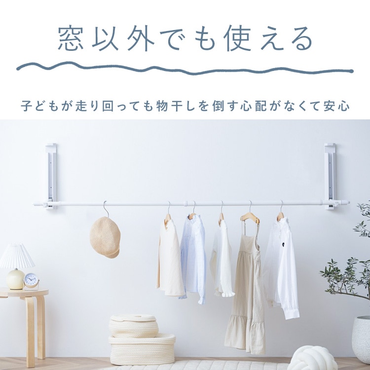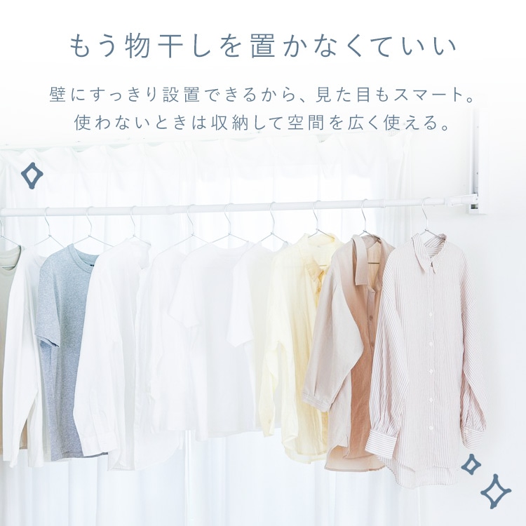 【商品説明】壁に設置して省スペースで使える室内物干しです。(※壁付けパーツ間の距離は、約149cm~233cm以内になるように設置してください。)ワンタッチで開くので、手がふさがっているときでも便利です。使わないときは竿ごと収納できるので置き場所に困りません。使用時の奥行きは約32cmとなるため、干した衣類が壁やカーテンに当たりにくいです。設置は専用のピンをクロスして刺すので、重さが分散してピンが抜けにくいです。壁に空く穴は画鋲と同じくらいの大きさなので、取り外しても目立ちにくいです。(※本製品は石膏ボード専用です。コンクリート、土壁などには設置できません。)★お客様組立★【商品仕様】●製品サイズ(cm)カバー+本体(使用時):幅約66.9×奥行約37.3×高さ約40.4伸縮竿:長さ約163~255●製品質量約2.6kg●耐荷重(全体)約12kg※耐荷重は測定値であり、保証値ではありません。●主要材質スチールパイプ(エポキシ樹脂塗装)、ステンレス巻きスチールパイプ(エポキシ樹脂塗装)、スチール(亜鉛メッキ)、アルミ(エポキシ樹脂塗装)、ABS樹脂、ポリプロピレン、SBR樹脂、ステンレス●必要工具+ドライバー(サイズ:2番)※インパクトドライバーは使用しないでください。破損するおそれがあります。※2人以上での組み立てをおすすめします。【ご注意】※本製品は石膏ボード専用です。コンクリート、土壁などには設置できません。※洗濯物はバランスよく掛けてください。掛け方が片寄ると破損する恐れがあります。※壁付けパーツ間の距離は、149cm~233cm以内になるように設置してください。※設置する高さは、ご使用の環境に合わせて伸縮竿がカーテンレールの上に来るように設置してください。