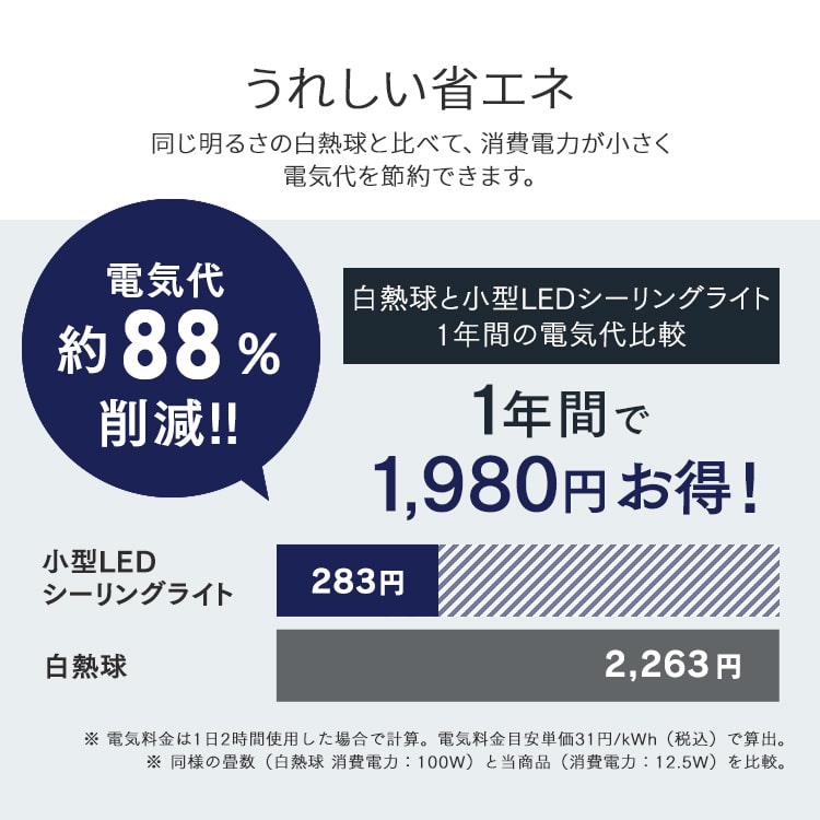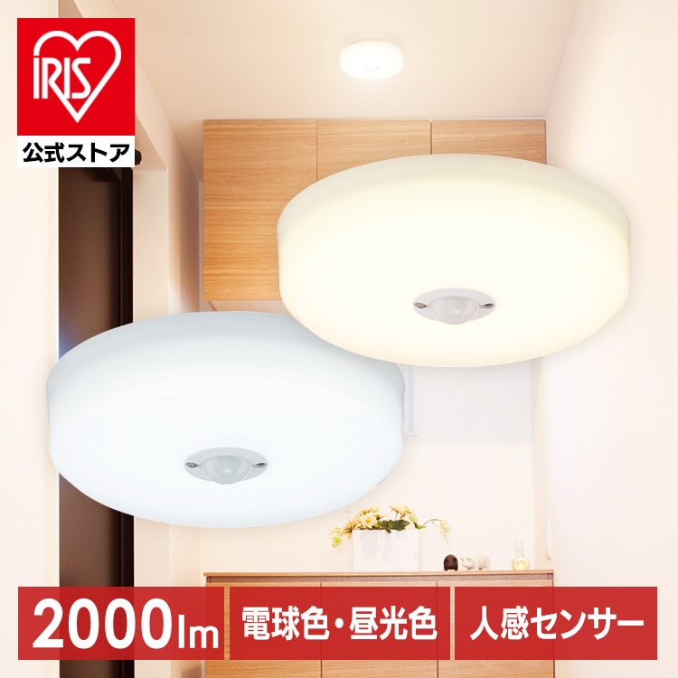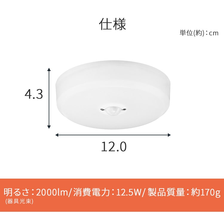 【商品説明】コンパクトでもしっかり明るいLED小型シーリングライトです。小型で場所を取らないので、トイレや洗面所、廊下やクローゼットなどの照明におすすめです。人を感知して自動でON/OFFになる人感センサー付きです。色がより自然に見える「演色性:Ra80以上」です。同じ明るさの白熱灯と比べて消費電力が小さく、電気代を節約できます。基盤とカバーが一体となる構造のため、ホコリや虫が入りにくいです。電気工事・工具不要で取り付けが簡単です。【商品仕様】●商品サイズ(cm)直径約12×高さ約4.7(端子除く)●質量約170g●器具光束2000lm●色温度電球色:3000K昼光色:6500K●定格電圧、周波数AC100V、50/60Hz●定格消費電力12.5W●定格入力電流0.22A●待機消費電力0.1W●演色性Ra85●点灯照度100lx以下●検知範囲2.4mの天井に取り付けた際に半径約2.4m●設計寿命40000時間※LEDモジュールの設計寿命は、LEDが点灯しなくなるか初期光束の70%に低下するまでの総点灯時間のいずれか短い時間を推定したものです。製品の寿命を保証するものではありません。