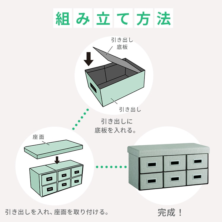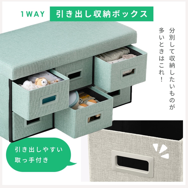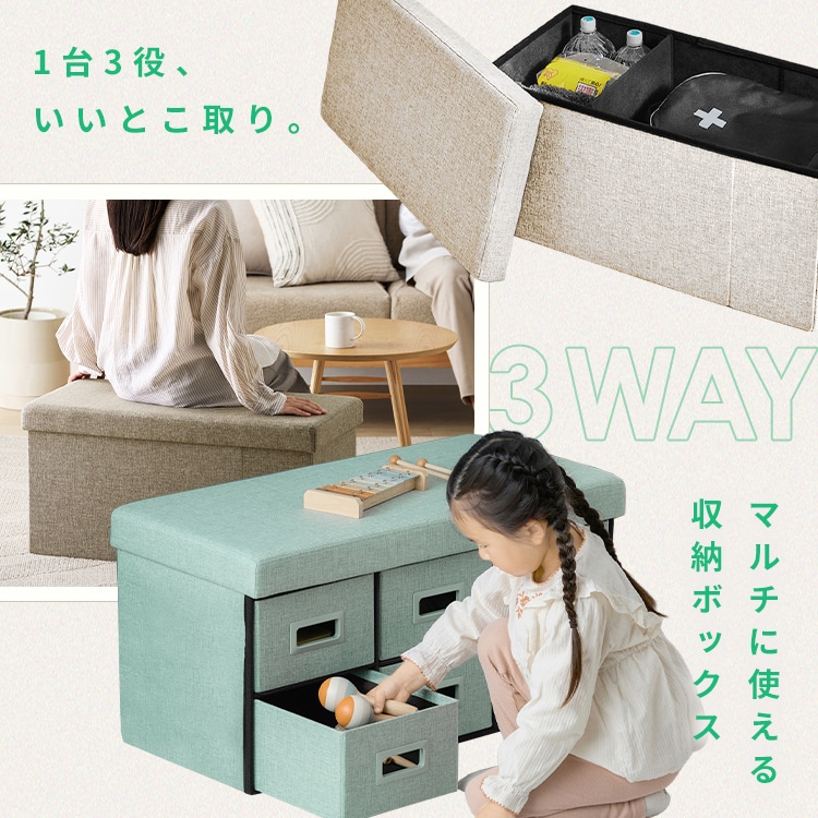 【商品説明】1台で3役、マルチに使える引き出し収納ボックス。シンプルなデザインとかわいいカラーでお部屋にもなじみやすい。【3WAYで使い方いろいろ!】1/引き出し収納ボックス:分別して収納したいものが多いときに!2/収納スツール:引き出し面を上にして収納すれば、椅子としても使える。3/ワイド収納スツール:仕切りを外して大きなモノも収納可能。※破損につながる恐れがあるため、引き出し収納ボックスの状態では座らないでください。【引き出しだけでも使える】引き出しの奥行き“約33cm”。アイリスオーヤマのメタルラックシリーズや、連結スチールラックシリーズの奥行きにぴったり。【組み立てカンタン!】簡単に組み立て可能。コンパクトに折りたたんで収納もできる。★お客様組立(工具不要)★【商品仕様】●製品サイズ(cm)使用時外寸:幅約76×奥行約37.5×高さ約38.5座面の高さ:約38.5本体内寸:幅約72.5×奥行約33.5×高さ約33.5引き出し(1個あたり)内寸:幅約22.5×奥行約33×高さ約14折りたたみ時:幅約76×奥行約37.5×高さ約13※破損する恐れがあるため、収納ボックスとして使用するときは座らないでください。●製品質量約10.7kg●構造部材繊維板●張り材ポリエステル●クッション材ウレタンフォーム●耐荷重収納ボックス時:天面約10kg/引き出し(1個あたり)約3kgスツール時:約80kg※耐荷重は測定値であり、保証値ではありません。