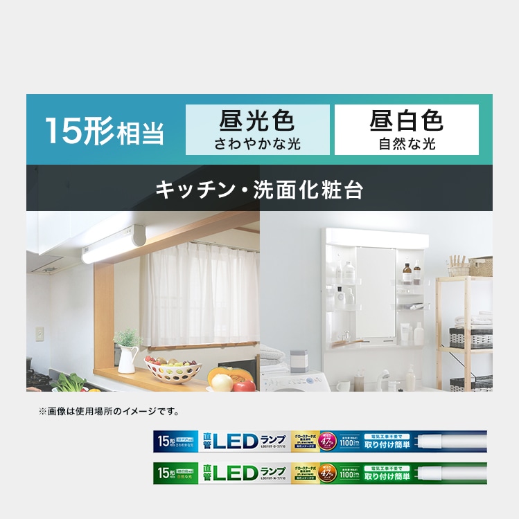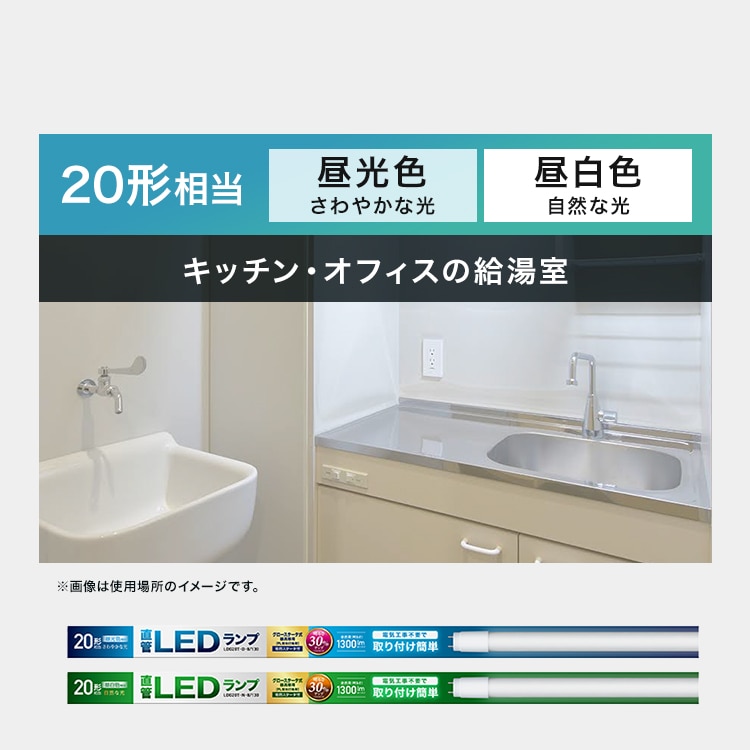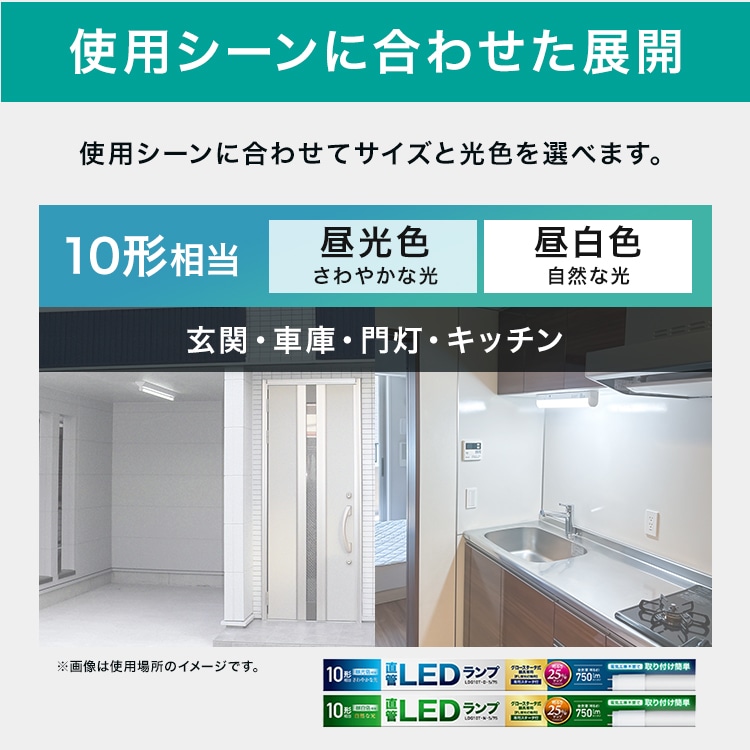 【商品説明】電気工事不要で、簡単に取り付けができる直管LEDランプです。グロースターター式器具専用[FL蛍光灯専用]です。従来の蛍光灯に比べて消費電力が削減できるので、電気代を節約できます。キッチンや洗面所、クローゼットなどでの使用におすすめです。※本製品はグロースタータ式器具専用です。他の種類の器具(ラピッドスタータ式[FLR蛍光灯用]、インバータ式[FHF蛍光灯用])では使用できません。【商品仕様】【10形】●型番昼光色:LDG10T・D・5/75昼白色:LDG10T・N・5/75●製品サイズ(cm)管径約2.6×長さ約33●製品質量約74g●色温度昼光色:6500K昼白色:5000K●全光束750lm●定格消費電力5.1W●定格電圧AC100V●定格周波数50/60Hz●演色性Ra83●光束維持時間約40000時間※光束維持時間とは、全光束が70%に低下するまでの時間を推定したものです。表示は設計時間であり、製品の寿命を保証するものではありません。●付属品専用スタータ(口金:E17)※本製品専用です。一般の蛍光灯照明器具には使用できません。【15形】●型番昼光色:LDG15T・D・7/110昼白色:LDG15T・N・7/110●製品サイズ(cm)管径約2.6×長さ約43.6●製品質量約93g●色温度昼光色:6500K昼白色:5000K●全光束1100lm●定格消費電力7W●定格電圧AC100V●定格周波数50/60Hz●演色性Ra83●光束維持時間約40000時間※光束維持時間とは、全光束が70%に低下するまでの時間を推定したものです。表示は設計時間であり、製品の寿命を保証するものではありません。●付属品専用スタータ(口金:E17)※本製品専用です。一般の蛍光灯照明器具には使用できません。【20形】●型番昼光色:LDG20T・D・8/130昼白色:LDG20T・N・8/130●製品サイズ(cm)管径約2.6×長さ約58●製品質量約115g●色温度昼光色:6500K昼白色:5000K●全光束1300lm●定格消費電力8.2W●定格電圧AC100V●定格周波数50/60Hz●演色性Ra83●光束維持時間約40000時間※光束維持時間とは、全光束が70%に低下するまでの時間を推定したものです。表示は設計時間であり、製品の寿命を保証するものではありません。●付属品専用スタータ(口金:E17)※本製品専用です。一般の蛍光灯照明器具には使用できません。