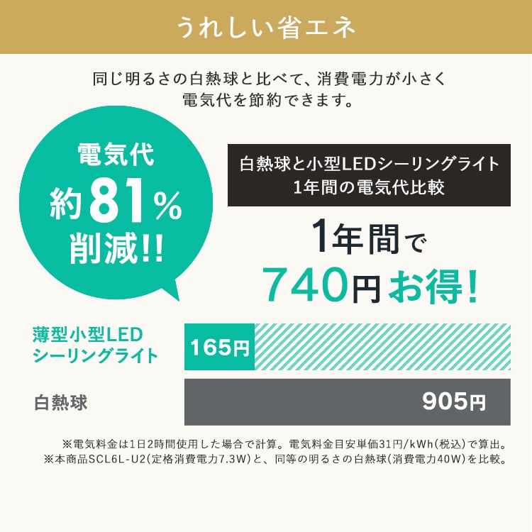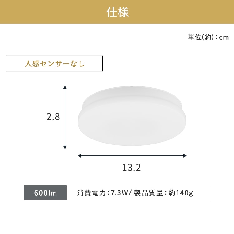 【商品説明】天井すっきり。ワンランク上の空間を。薄形LED小型シーリングライト[600lm/工事不要/簡単取付]◆くるっと回すだけ!簡単に取り付け可能現在お使いの照明器具と取り換えるだけの簡単取り付け。工事・工具も不要です。◆天井すっきり、薄型シーリング圧迫感がなく、空間が広く感じられます。◆場所に合わせて選べる光色[電球色]あたたかみのある光。リラックスしたい空間に。[昼白色]自然に近い光。目に優しく、作業部屋向き。[昼光色]爽やかですっきりとした光。細かい作業を行う空間に。◆色がより自然に見える演色性:Ra85演色性が高いほど、肌や食べ物の色がより美しく自然に見えます。クローゼットやキッチン、ダイニングにもおすすめです。◆うれしい省エネ同じ明るさの白熱球と比べて、消費電力が小さく電気代を節約できます。【商品仕様】●品番/色温度SCL6L-U2/3000K(電球色相当)SCL6N-U2/5000K(昼白色相当)SCL6D-U2/6500K(昼光色相当)●全光束600lm●定格電圧AC100V(50/60Hz)●演色性Ra85●定格消費電力7.3W●入力電流0.13A●光束維持時間※約40000時間●外形寸法(cm)直径約13.2×高さ約2.8(取付部除く)●質量(kg)約0.14●使用温度5℃~35℃※光束維持時間とは全光束が70%に低下するまでの時間を推定したものです。表示は設計時間であり、製品の寿命を保証するものではありません。