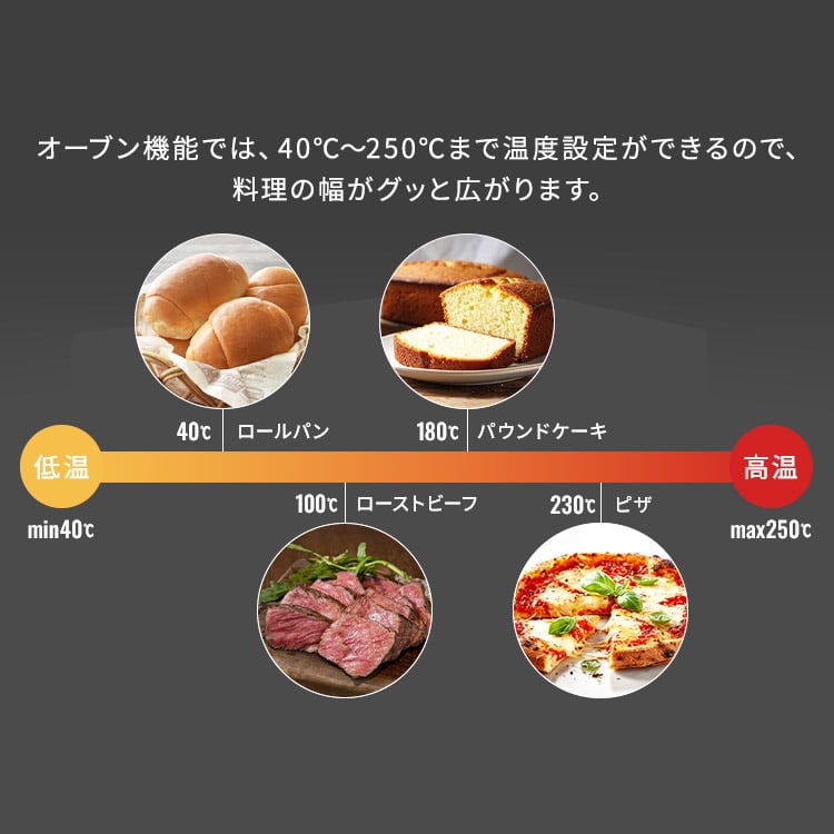 温度調節:40℃(発酵)、110~250℃(庫内温度が高いときは210℃まで)