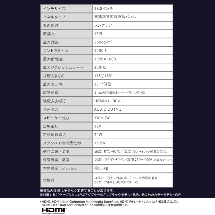 【商品説明】各種ゲーム機との動作確認済み、性能にもカラーにもこだわったゲーミングモニターです。(※動作確認情報は各ゲーム機との接続テストを実施したものであり、ご利用になるすべてのソフトウェアでの動作を保証するものではありません。)動きの速い映像でもなめらかに表示される高リフレッシュレート[23インチ:200Hz/27インチ:180Hz]です。(※ディスプレイに接続する機器が、各リフレッシュレート出力に対応している場合に限ります。)残像が少なく、動きの速い映像もくっきり表示される[応答速度:1ms(GTG)]です。細部までクリアに見える高解像度[23インチ:FHD(1920×1080)/27インチ:WQHD(2560×1440)]です。上下左右178°の高視野角で、角度が変わっても色や明るさの変化が少なく、画面の細部まで自然な見え方を保ちます。豊かな色彩表現により、色の違いを細部までしっかり映し出し、ゲームの世界をより鮮やかに・よりリアルに描写します。各映像に最適化されたモード[映画/ゲーム/ブルーライト軽減/FPS/標準 など]を選択可能です。映像や作業に集中しやすい、フレーム(縁)が狭く、画面が広めのスリムベゼルデザインです。映り込みや光の反射によるギラつきがない、非光沢(ノングレア)タイプの画面です。明るさ調節のためのLEDバックライトの高速点滅(ちらつき)を抑えた、フリッカーレス設計です。スピーカーを搭載しているので、映画や音楽も楽しめます。前後に動かして見やすい角度に調節できます。マウント取付対応なので、スタンドを外して壁掛けやアームに取り付けての使用も可能です。【商品仕様】【27インチ:DG-AW2718S】●インチサイズ27インチ●パネルタイプ高速応答広視野角パネル●表面処理ノングレア●縦横比16:9●最大輝度400cd/m2●コントラスト比1000:1●最大解像度2560×1440●最大リフレッシュレート180Hz●視野角(H/V)178°/178°●最大表示色1677万色●応答速度1ms(GTG)(※オーバードライブON時)●チルト角+5°~-15°±2°●マウント取付用穴100mm×100mm●映像入力端子HDMI×2、DP×2●音声出力AUDIO OUT×1●スピーカー出力1W+1W●定格電圧12V●定格消費電力40W●スタンバイ時消費電力<0.5W●温度/湿度条件(結露なきこと)動作:0~40℃/10~90%保管:-20~60℃/10~90%●製品サイズ(cm)スタンド含む:幅約61.3×奥行約17×高さ約48.1スタンド無し:幅約61.3×奥行約6×高さ約36.3●製品質量スタンド含む:約4.5kgスタンド無し:約4.1kg●付属品スタンド(支柱・台座・ねじ)、取扱説明書、DPケーブル、ACアダプター、電源コード【23インチ:DG-AF2320S】●インチサイズ23.8インチ●パネルタイプ高速応答広視野角パネル●表面処理ノングレア●縦横比16:9●最大輝度300cd/m2●コントラスト比1000:1●最大解像度1920×1080●最大リフレッシュレート200Hz●視野角(H/V)178°/178°●最大表示色1677万色●応答速度1ms(GTG)(※オーバードライブON時)●チルト角+5°~-15°±2°●マウント取付用穴75mm×75mm●映像入力端子HDMI×1、DP×1●音声出力AUDIO OUT×1●スピーカー出力1W+1W●定格電圧12V●定格消費電力24W●スタンバイ時消費電力<0.5W●温度/湿度条件(結露なきこと)動作:0~40℃/10~90%保管:-20~60℃/10~90%●製品サイズ(cm)スタンド含む:幅約54×奥行約17×高さ約41.7スタンド無し:幅約54×奥行約5.3×高さ約32●製品質量スタンド含む:約3.6kgスタンド無し:約3.2kg●付属品スタンド(支柱・台座・ねじ)、取扱説明書、DPケーブル、ACアダプター