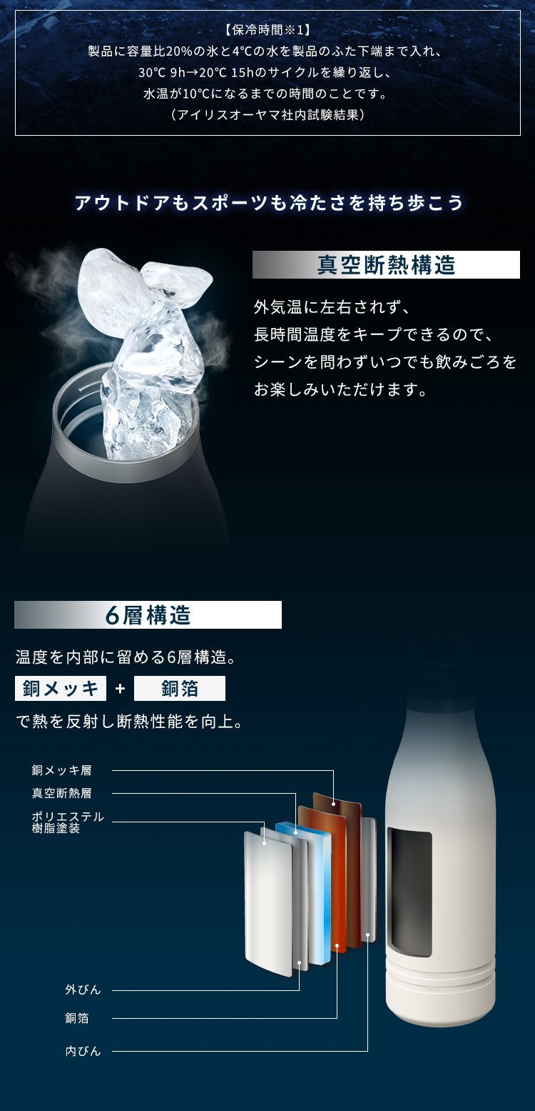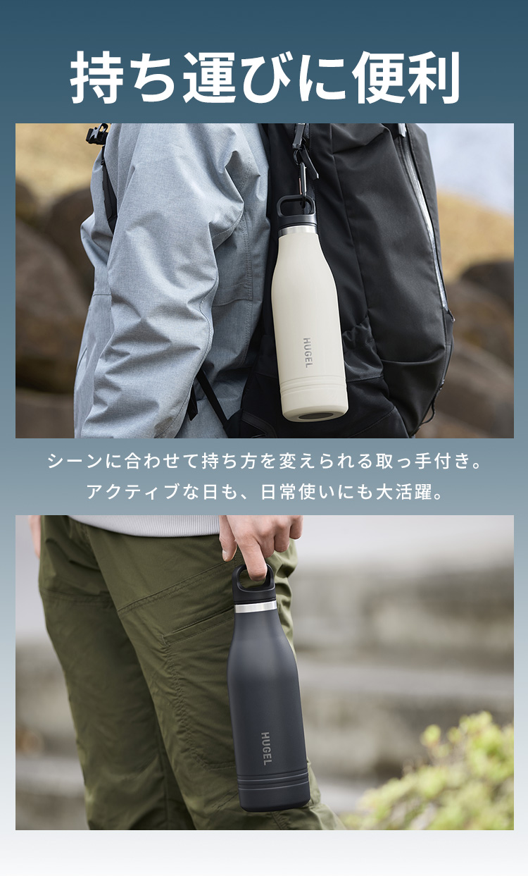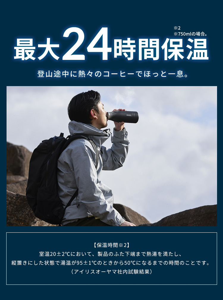【商品説明】温度を長時間キープする高保温・高保冷性能の真空断熱マグボトルです。ふたがパッキン一体型ふた構造でお手入れがらくらくです。カラーはアッシュホワイトとチャコールグレーの2色です。内部構造は温度を内部に留める6層構造になっています。銅メッキ+銅箔で熱を反射し断熱性を向上させます。普段使いからアウトドアまで持ち運びが簡単にできるので、どこでも活躍できます。スタイリッシュなデザインでハンドル付きの500mlタイプです。【商品仕様】●商品サイズ(cm) 直径約7.3×高さ約24.3 ●商品重量 約230g ●規格 HSB-500 ●実容量 0.5L ●保冷時間※1 約24時間 ●保温時間※2 約18時間 ●保冷効力※3 7度以下(6時間) ●保温効力※4 77度以上(6時間) ●主要材質 ・本体:ステンレス鋼(ポリエステル樹脂塗装) ・ふた:ポリプロピレン、ポリブチレンテレフタレート、シリコーンゴム ※1 保冷時間/製品に容量比20%の氷と4℃の水を製品のふたまたはせんユニット下端まで入れ、30℃9h→20℃15hのサイクルを繰り返し、水温が10℃になるまでの時間のことです。(社内試験結果) ※2 保温時間/室温20±2℃において、製品のふたまたはせんユニット下端まで熱湯を満たし、縦置きにした状態で湯温が95±1℃のときから50℃になるまでの時間のことです。(社内試験結果) ※3 保冷効力/室温20±2℃において、製品のふたまたはせんユニット下端まで冷水を満たし、縦置きにした状態で、水温が4±1℃のときから6時間放置した場合におけるその水の温度のことです。 ※4 保温効力/室温20±2℃において、製品のふたまたはせんユニット下端まで熱湯を満たし、縦置きにした状態で、湯温が95±1℃のときから6時間放置した場合におけるその湯の温度のことです。 ●カラー アッシュホワイト、チャコールグレー
