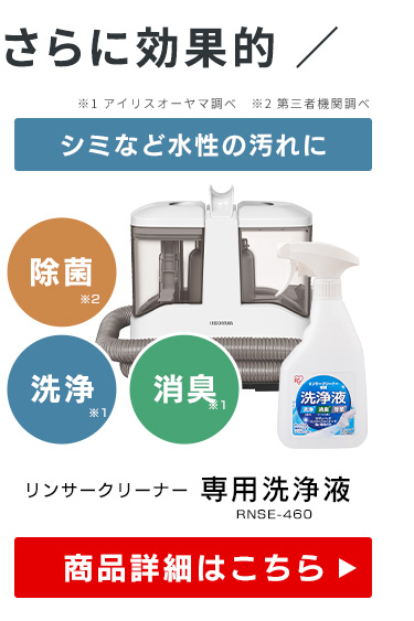 【商品説明】水を吹きかけ汚れを浮かせ、浮かせた汚れを水と共に吸い取ることができるリンサークリーナーです。電動ポンプ付きで、レバーを引くだけでラクに水を吹きかけることが出来ます。業務用の技術を、手軽に家庭でご使用いただけるよう、コンパクトな設計にしました。ソファや車のシートなど、布製品の洗浄に最適です。ブラシ付きヘッドで、汚れをかき出し吸引できます。T型ヘッドで、汚れの溜まりやすい隅や溝の汚れも吸引できます。【商品仕様】●電源AC100V・50/60Hz●消費電力450W●回収タンク有効容量約0.5L●清水タンク容量約1.0L●ホース長さΦ29mm×1.5m●お湯使用温度40℃まで●製品寸法(本体寸法)(cm)幅約25.7×奥行約17.1×高さ約27.2●製品質量約2.7kg●電源コードの長さ約3.0m●付属品ブラシ付きヘッド、T型ヘッド、コードフック・ホルダー●主要材質ABS樹脂、PP(ポリプロピレン)●おすすめの洗剤など・強アルカリイオン水・重曹・クエン酸・次亜塩素酸水・リンサーの洗剤(RNSS-300K)・そのほか発砲性の低い洗剤※発砲性の高い洗剤は、クリーナー内部に泡が侵入し故障するおそれがあるので使用しないでください。
