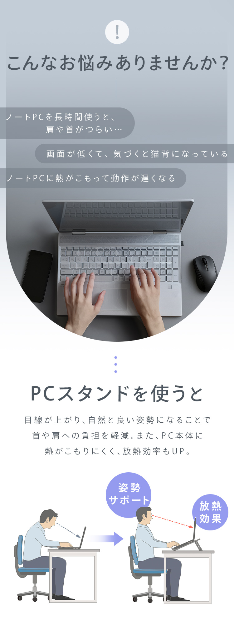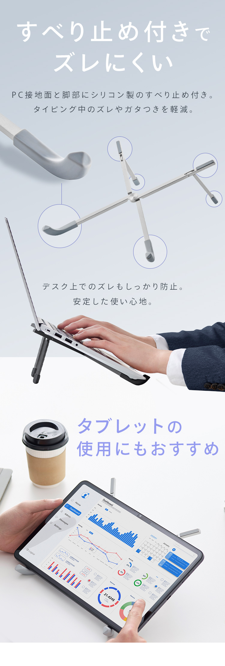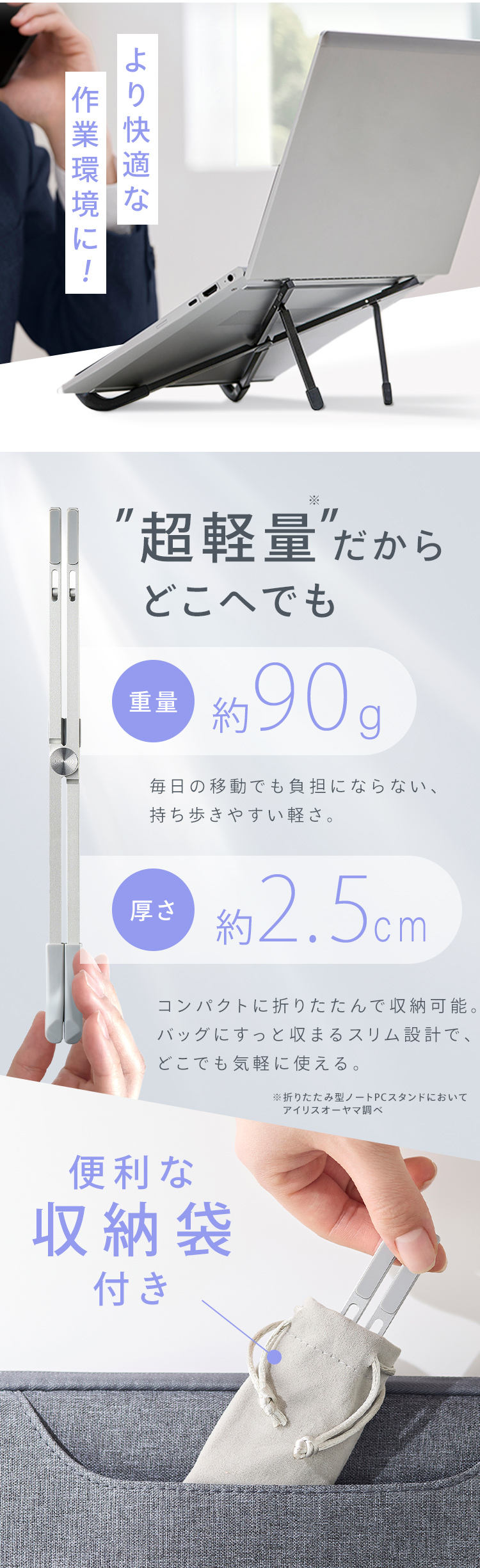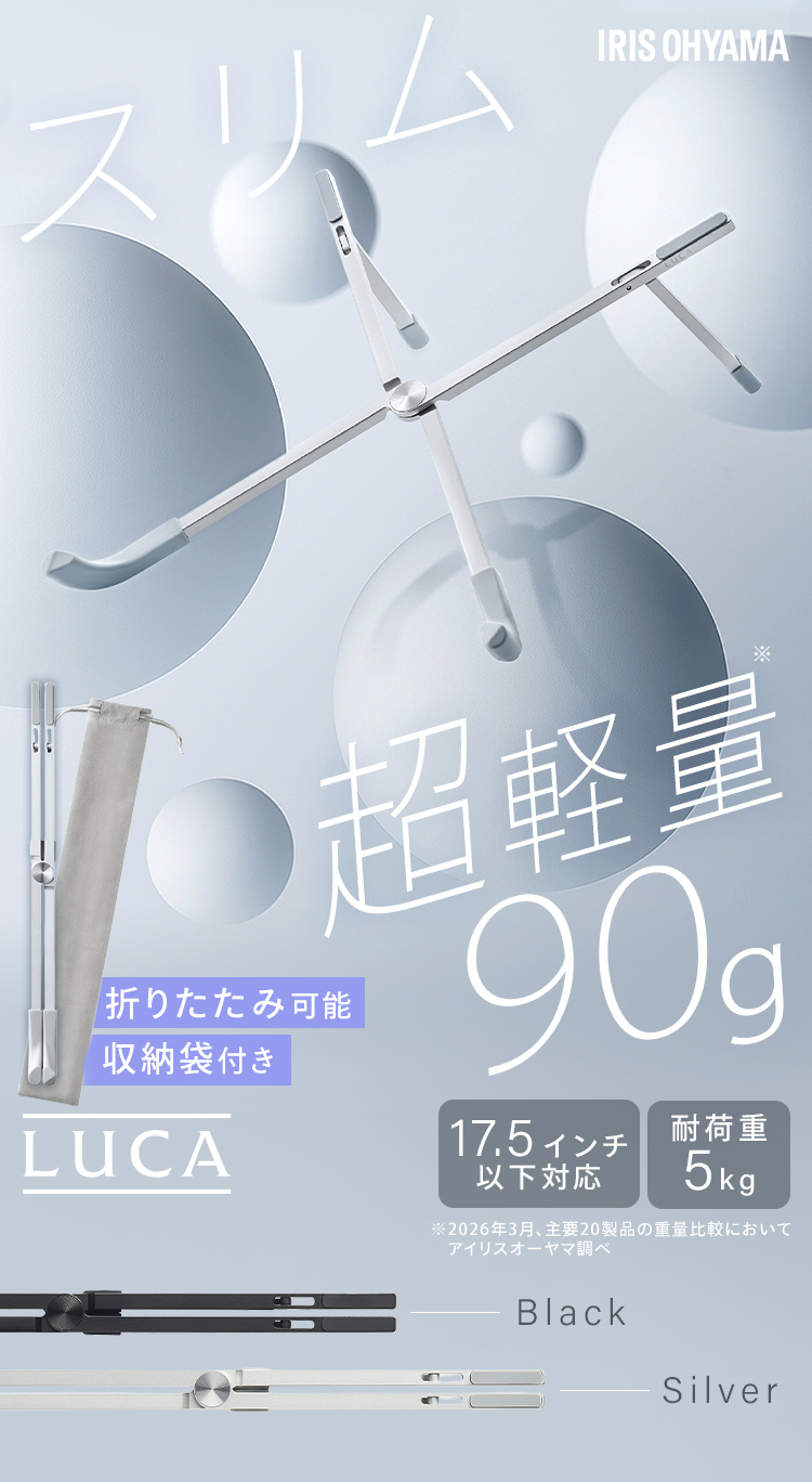 【商品説明】画面の高さや角度を調整できるため、視線が自然と上がり、姿勢が改善します。そのため首や肩への負担を軽減し、長時間の作業もより快適になります。PCの下に空間が生まれることで通気性が向上し、熱がこもりにくくなるのもポイントです。・折りたたみ可能で収納用袋も付属しているので、外出/出張時の持ち運びに適しています。・約100gと軽量且つスリム設計なのでリュックにすっぽり収まります。【商品仕様】●製品サイズ(cm)※折りたたみ時幅約30.0×奥行約1.96×高さ約2.5●製品質量約90g●対応サイズ(目安)ノートパソコン、タブレット17.5インチ以下●耐荷重約5kg●材質アルミニウム合金、シリコーン●付属品収納袋×1、安全上の注意×1