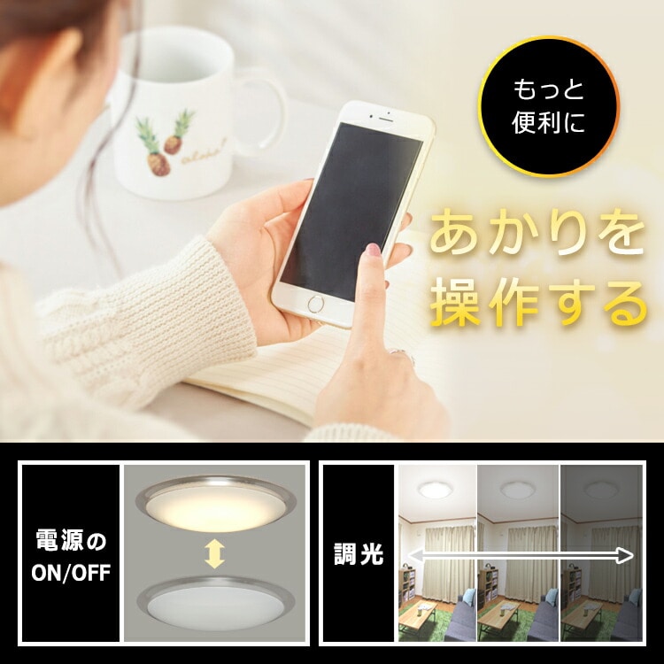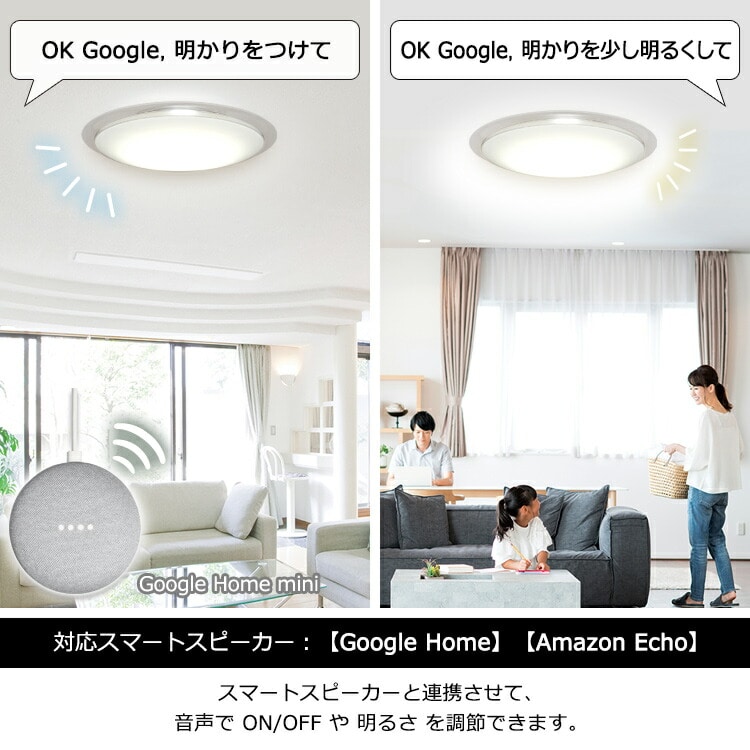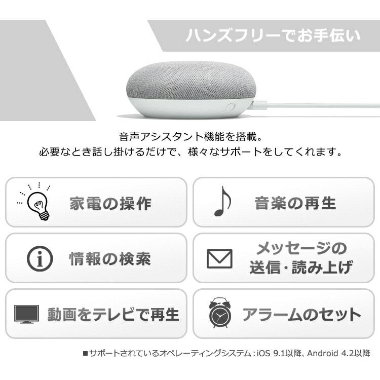 【GoogleHome Mini】●商品サイズ直径:約98mm高さ:約42mm●重量本体:約173g電源アダプターおよびケーブル:約75g●電源ケーブル長さ1.5m●材質耐久型ファブリック製トップ滑り止めシリコンベースリサイクル素材で作成されたプラスチック製ケース●サポートされているオーディオ形式HE-AACLC-AAC+MP3VorbisWAV (LPCM)FLAC●無線802.11b/g/n/ac (2.4 GHz / 5 GHz) Wi-Fi●音響高感度の音声認識がハンズフリーでの利用をサポート40mmドライバー採 360度サウンドBluetooth対応●電源5 V、1.8 A●ポートとコネクタマイクロ USBポート●サポートされているオペレーティングシステムAndroid 4.2以降iOS 9.1以降※Wi-Fiの利用には 802.11 a/b/g/n/acアクセスポイント(ルーター)が必要です。Google Home AppがインストールされているWi-Fi対応端末●セット内容Google Home Miniクイックスタートガイド電源アダプターおよびケーブル【LEDシーリングライト 6.0 デザインフレームタイプ 12畳 調光】●適用畳 数~12●定格電圧100V(50/60Hz)●色温度昼光色相当●演色性(Ra) 85●器具光束(lm) 5499●定格消費電力39.2W●発光効率約140lm/W●消費電力リモコン1段階5W●入力電流値0.41A●設計寿命(h) 40000●商品サイズ(cm)直径70×高さ12.7●調光10段階●調色×●明かりメモリ○●おやすみタイマー10分、30分●明るさセンサ×●留守番機能○●点灯タイマー○●シーン×●付属品リモコン●対応機種Google Home、Amazon Echoシリーズ