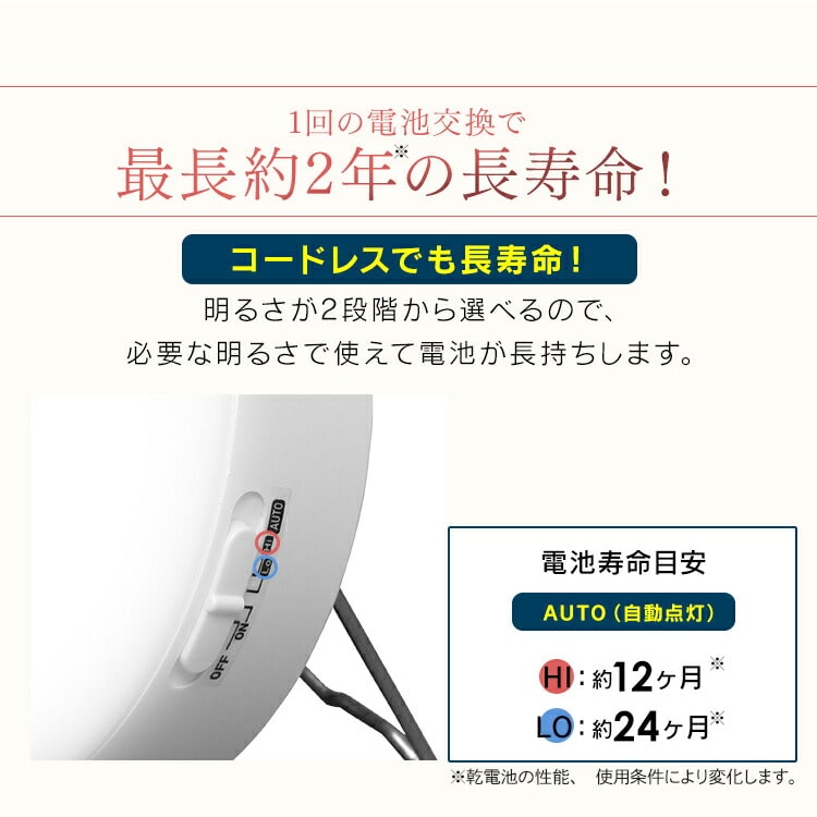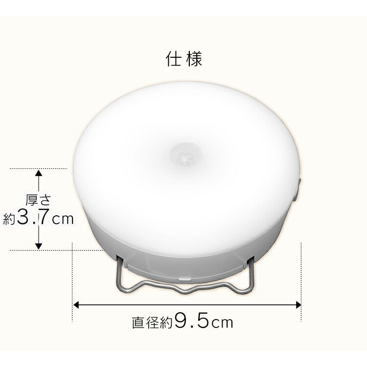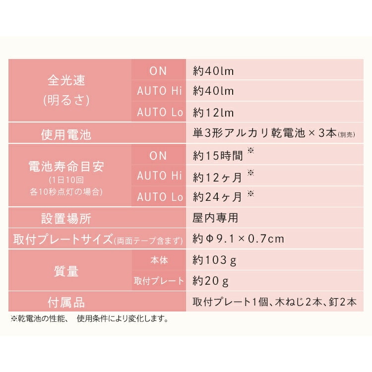 ●商品サイズ(cm)本体:直径約9.5×高さ約3.7取り付けプレート:直径約9.1×高さ約0.7※両面テープ含まず●商品重量本体(電池含まず):約103g取り付けプレート(両面テープ含まず):約20g●光源;0.5W-LED×4個●全光束(明るさ)ON:約40lmAUTO Hi:約40lmAUTO Lo:約12lm●感知センサー:赤外線受動式センサー●明暗センサー:フォトセンサー●点灯保持時間:ON/常時点灯、AUTO/約10秒(感知中は常時点灯)●点灯モード:OFF・ON・AUTOLo・AUTOHi●使用電池:単3形アルカリ乾電池×3本(別売)●電池寿命目安(1日10回各10秒点灯の場合)ON:約15時間AUTO Hi:約12ヶ月AUTO Lo:約24ヶ月※乾電池の性能、使用条件により変化します。●センサー感知距離:約2.5mまで●センサー感知角度:水平 約100°/垂直 約40°●設置場所:屋内専用●付属品:取り付けプレート1個、木ねじ2本、釘2本●カラー:昼白色相当(BSL-40MNWV2)・電球色相当(BSL-40MLWV2)