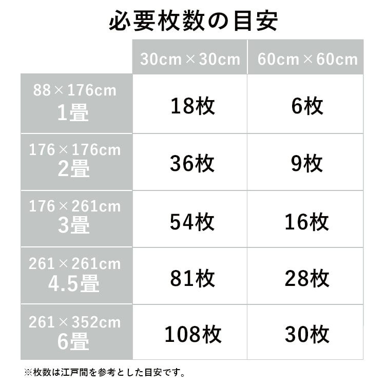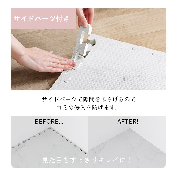 【商品説明】ジョイントマットで上品なお部屋が作れちゃう。セット内容:(正方形マット×9枚、サイドパーツ×12枚)×6個正方形サイズ:30×30cm 厚さ2cm9枚敷き詰めると約畳半畳分。◆上品なお部屋に、3つのおしゃれなデザイン大理石柄:やわらかな色合いと大胆なマーブル模様が、高級感を演出ドット柄:シンプルながらも目を引くかわいらしさ、洗練された雰囲気にテラゾー柄:石粒の模様と色がランダムにミックスされたデザイン性の高い柄、明るい印象に◆優れた断熱性・保温性、オールシーズン快適断熱性・保温性に優れ、夏のべたつきや冬のヒヤッと感を軽減。床暖房にも対応。◆しっかりとした厚さ2cm、防音対策気になる生活音を軽減。クッション性に優れているので転んでも衝撃を和らげる。弾力のある素材でペットや家具からの傷を防止。ストレッチの際のマットとしても活躍。サッと敷けてとっても便利。◆赤ちゃんと一緒に使える、低ホルムアルデヒドホルムアルデヒドの検査は基準を下回る結果で合格。赤ちゃんにも安心。※ホルムアルデヒド(A/Ao)0.05以下。壁に沿って設置すれば、ウォールクッションとしても大活躍!◆汚れても安心、お手入れラクラク仕様・優れた防水性 飲み物などをこぼしてもサッとひと拭き。・水洗いOK 汚れた部分だけ取り外して水洗い可能なのでいつでも清潔。・水回りでも活躍 水に強い素材なのでキッチンや洗面所などでの使用もおすすめです。・サイドパーツ付き サイドパーツで隙間をふさげるのでゴミの侵入を防げます。◆お部屋に合わせて簡単にカット可能はさみやカッターで簡単に裁断できるので、家具やお部屋に合わせて調節できます。【商品仕様】●セット内容(正方形マット×9枚、サイドパーツ×12枚)×6個●商品サイズ(cm) (1枚あたり)幅約30×奥行約30×高さ約2●カラー大理石、テラゾー、ドット●使用枚数目安(江戸間/京間)1畳(江戸間:88×176cm/京間:95×191cm) 30×30cm:18枚/24枚 60×60cm:6枚/8枚2畳(江戸間:176×176cm/京間:191×191cm) 30×30cm:36枚/49枚 60×60cm:9枚/16枚3畳(江戸間:176×261cm/京間:191×286cm) 30×30cm:54枚/70枚 60×60cm:16枚/20枚4.5畳(江戸間:261×261cm/京間:286×286cm) 30×30cm:81枚/100枚 60×60cm:28枚/25枚6畳(江戸間:261×352cm/京間:286×382cm) 30×30cm:108枚/130枚 60×60cm:30枚/35枚