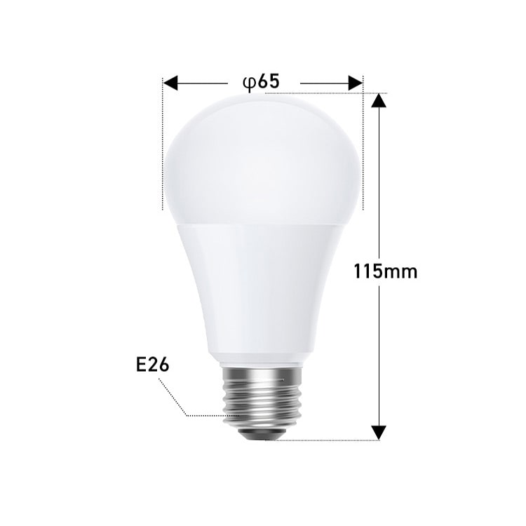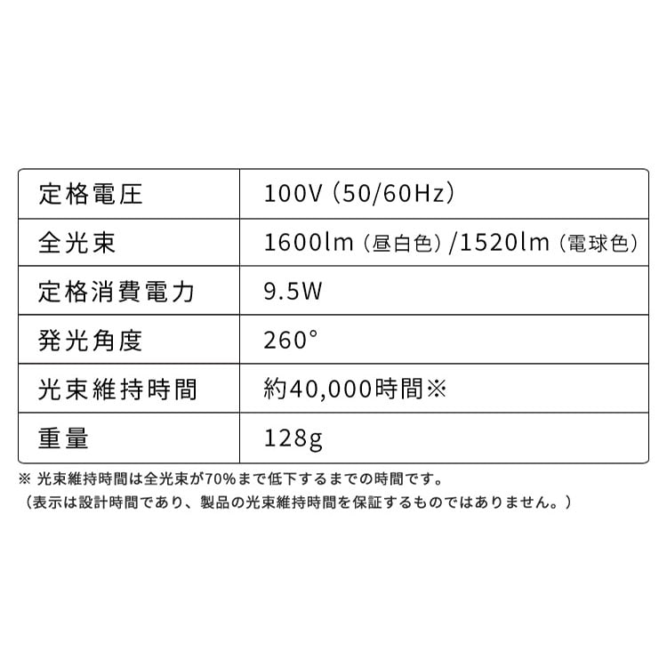 【商品説明】2027年度省エネ法目標基準値達成LED電球。全方向タイプ、約260°。◆好みに合わせて色味や明るさをチョイス・昼白色相当太陽光に近い自然な光。メイクをする・服を選ぶ場所に。・電球色相当あたたかみのある光。リラックスしたい空間に。・40w読書灯やデスクライトに。寝室の間接照明としても。・60wリビングやダイニングのメイン照明として。・100wガレージや作業場など明るさが必要な場所に。◆全方向タイプ、約260°広範囲を明るく均等に照らし、光がきれいに広がります。◆LED電球の特徴一般白熱電球の約40倍長持ち。※1LED電球の光速維持時間は約40000時間。※2取り換えが面倒な高所にもおすすめです。※1 一般電球型7Wを1日10時間、365日使用した場合。※2 全光束が70%まで低下する時間のこと。(表示は設計時間であり、製品の光束維持時間を保証するものではありません◆電気代がお得に2027年度省エネ法目標基準値達成。白熱電球をLEDに換えることで効果的な節電に。◆他にも!LED電球のいいところ・すぐ明るくなる スイッチを入れた瞬間に明るく点灯します。・ON/OFFに強い 頻繁にON/OFFしても、光束維持時間が短くなりません。・虫が集まりにくい 虫が集まりやすい紫外線領域波長をほとんど出しません。・低UV・低赤外線 本などの色あせや紫外線による熱が気になりません。・水銀レス 環境に有害な水銀を含みません。◆より自然に見える光、演色性83演色性が高いほど、肌や食べ物の色がより美しく、自然に見えます。住宅の屋内照明の場合、Ra80以上が好ましいとされています。【商品仕様】●商品サイズ(cm)全長約115×外径約65mm※2●商品重量約128g●光色LDA10N-G/W-10T9、LDA10N-G/W-10T92P:昼白色相当(5000K)LDA10L-G/W-10T9、LDA10L-G/W-10T92P:電球色相当(3000K)●定格消費電力9.5W●定格入力電流0.190A●全光束LDA10N-G/W-10T9、LDA10N-G/W-10T92P(昼白色相当):1600lmLDA10L-G/W-10T9、LDA10L-G/W-10T92P(電球色相当):1520lm●配光角約260°●光束維持時間※140000h●電源交流100V(50/60Hz共用)●使用場所屋内用●ランプ全体の明るさ100形相当●口金サイズE26●密閉形器具対応○●使用不可器具調光機能付き誘導灯・非常用照明器具水銀灯器具など断熱材施工器具●エネルギー消費効率LDA10N-G/W-10T9、LDA10N-G/W-10T92P:昼白色相当(168.4lm/w)LDA10L-G/W-10T9、LDA10L-G/W-10T92P:電球色相当(160.0lm/w)※2027年度省エネ法目標基準値達成●5年保証※1光束維持時間は全光束が70%まで低下するまでの時間です。 表示は設計時間であり、製品の寿命を保証するものではありません。※2使用器具の種類によって、寸法が合わない、熱がこもるなどの要因により、使用できなかったり、寿命が短くなる場合があります。