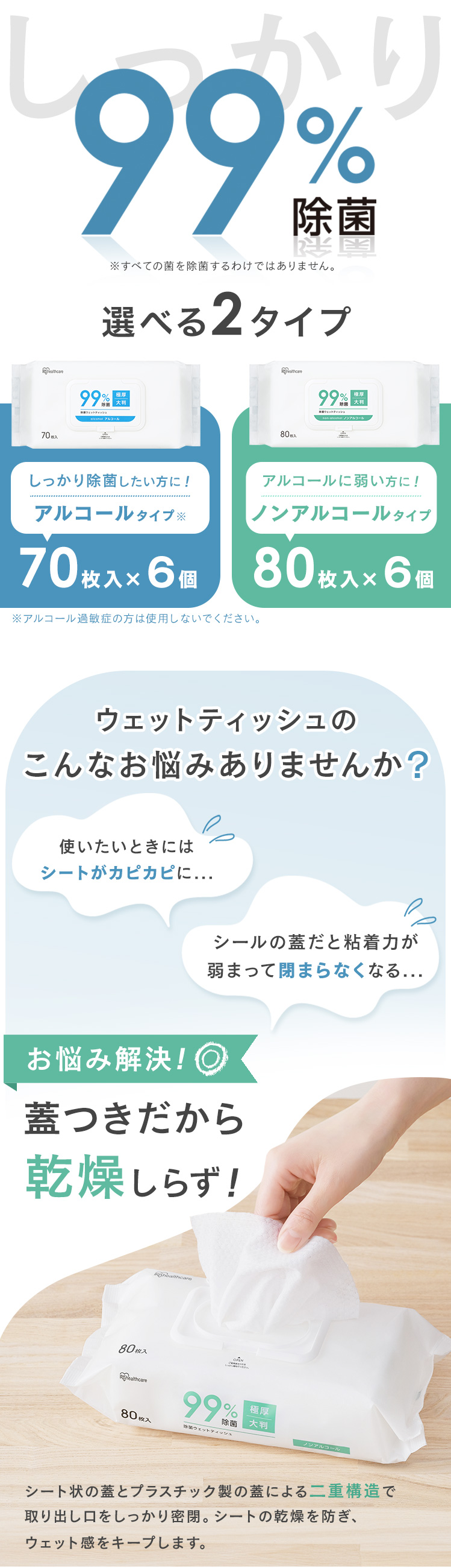 【商品説明】99%除菌ができるウェットティッシュです。大判の厚手シートで破れにくく、エンボス加工を施しているので、汚れもふき取りやすくお掃除にも適しています。テーブルやドアノブなどの身のまわりの除菌や手指の汚れの拭き取りなど幅広くお使いいただけます。かさばらず、持ち運びに便利です。1枚ずつ簡単に取り出せて、詰め替え容器不要のフィルムパックです。ふた付きで、しっかり密閉ができてシートの乾燥を防ぎます。【商品仕様】●枚数アルコール:420枚(70枚入り×6個)ノンアルコール:480枚(80枚入り×6個)●商品サイズ(cm)パッケージサイズ アルコール:幅約18.5×奥行約10×高さ約5.2 ノンアルコール:幅約18.5×奥行約10×高さ約6.2シートサイズ:約20×18●主要材質基布素材:PET、レーヨン●成分・アルコールタイプ水、エタノール、PG、乳酸Na、ラウリルグルコシド、ベンザルコニウムクロリド、セチルピリジニウムクロリド、グリセリン、ポリヘキサメチレンビグアナイド、ブチルパラベン、乳酸、グレープフルーツ果実エキス・ノンアルコールタイプ水、PG、ポリオキシアルキレンアルキルエーテル、ポリヘキサメチレンビグアナイド、ベンザルコニウムクロリド、セチルピリジニウムクロリド、ブチルパラベン、炭酸Na、グレープフルーツ果実エキス●タイプアルコール、ノンアルコール