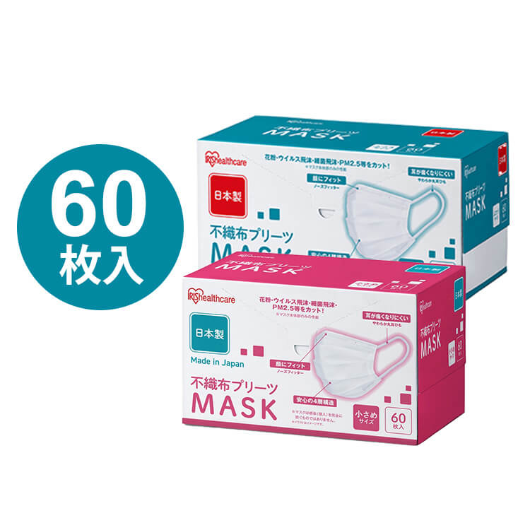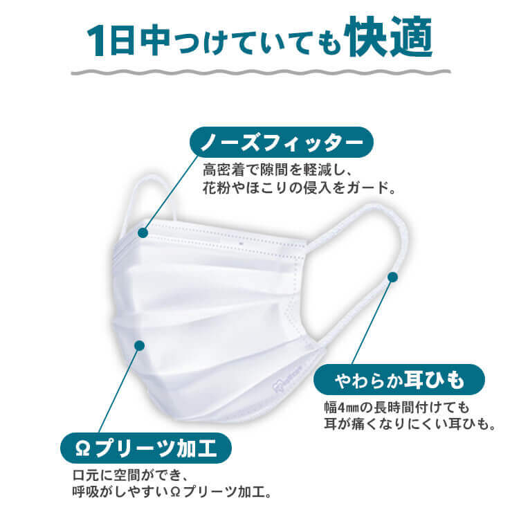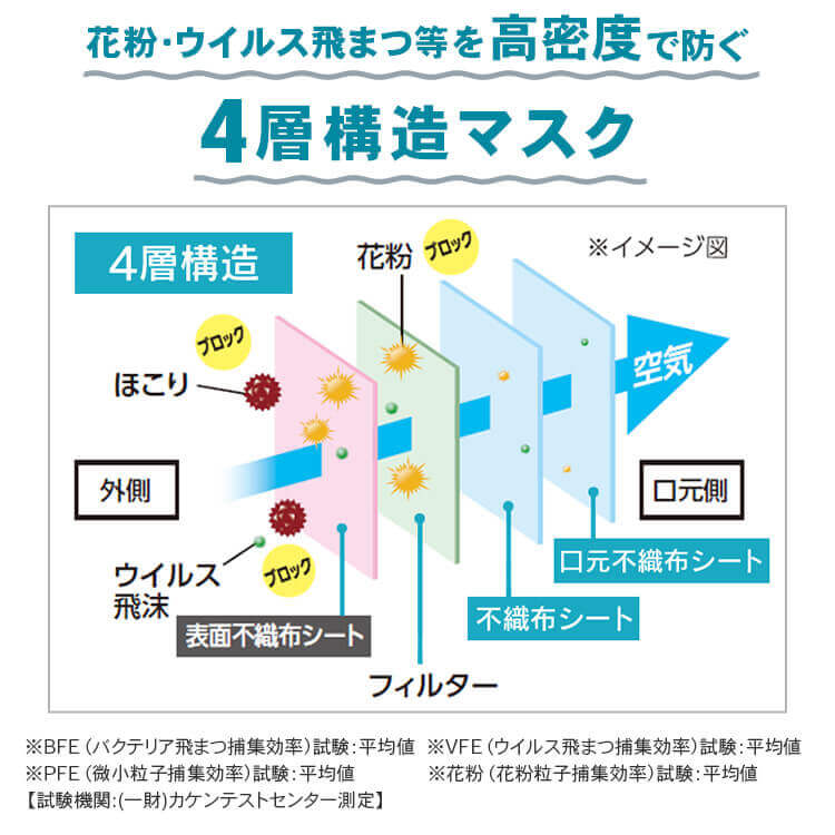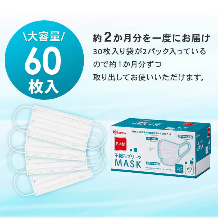4層構造マスク。◆花粉・ウイルス飛沫等を4層構造で防ぐウイルス飛沫、細菌飛沫、PM2.5などをカット!◆大容量60枚入り約2カ月分を一度にお届け。30枚入り袋が2パック入っているので、約1か月分ずつ取り出してお使いいただけます。◆1日中つけていても快適・ノーズフィッター 高密着で隙間を軽減し、花粉やほこりの侵入をガード。・Ωプリーツ加工 口元に空間ができ、呼吸がしやすいΩプリーツ加工。・やわらか耳ひも 長時間付けても耳が痛くなりにくい幅約4mmの耳ひも。