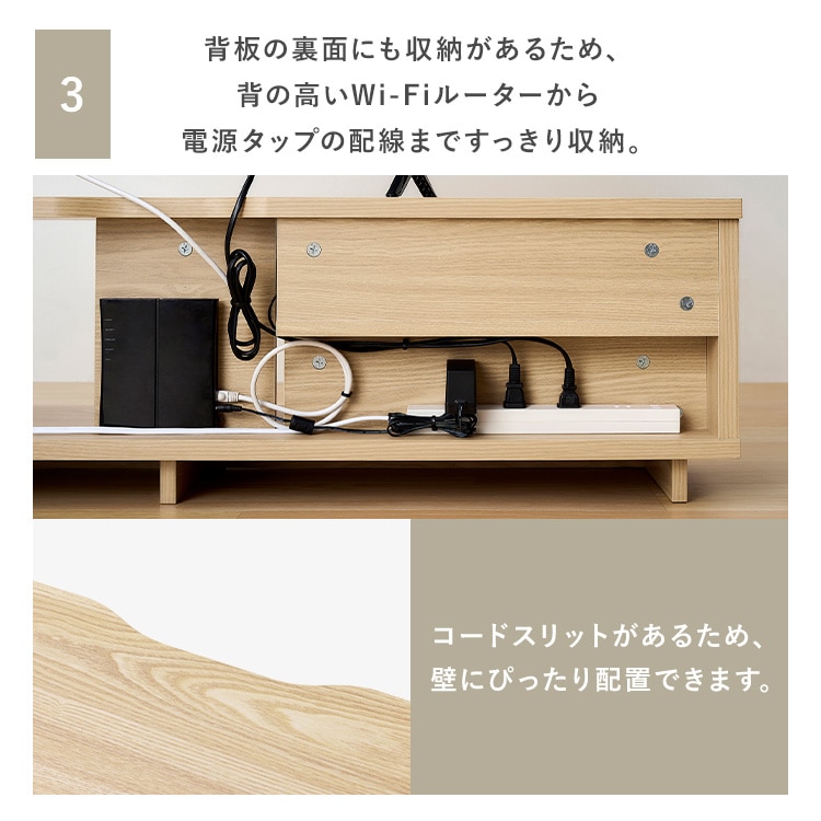 背板裏面にはタップ収納があり、配線コードもすっきりまとまる。
