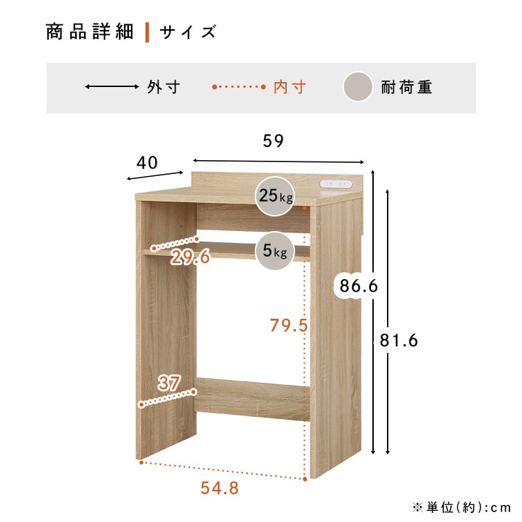 ●商品サイズ(cm)幅約59×奥行約40×高さ約86.6(本体外寸)●ゴミ箱収納スペース内寸可動棚設置無し:幅約54.8×奥行約37×高さ約79.5可動棚設置有り(高さは32mm間隔3段階可動):幅約54.8×奥行約37×高さ約63.2/約66.4/約69.6●商品質量約13kg●耐荷重天板:約25kg棚板:約5kg全体:約30kg●主要材質天板:合成樹脂化粧繊維版(メラミン樹脂)その他:プリント紙化粧パーティクルボード●電源コード仕様定格電圧:AC100V定格周波数:50/60Hz消費電力合計:1500Wまで●必要工具+ドライバー(サイズ:2番)※インパクトドライバーは使用しないでください。破損するおそれがあります。※2人での組み立てをおすすめします。