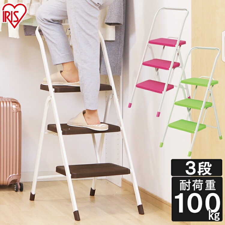●商品サイズ(cm) 使用時:幅約40×奥行約60×高さ約100.5 折りたたみ時:幅約40×奥行約8×高さ約114.5 ●ステップ高さ(cm) 1段目:約23.5、2段目:約45、3段目:約67●ステップサイズ(cm) 幅約34×奥行約22●耐荷重(約) 全体:100kg●主要材質 フレーム:スチール ステップ:ポリプロピレン