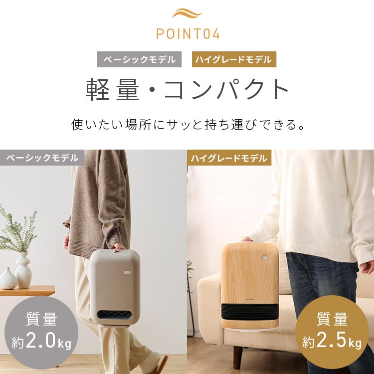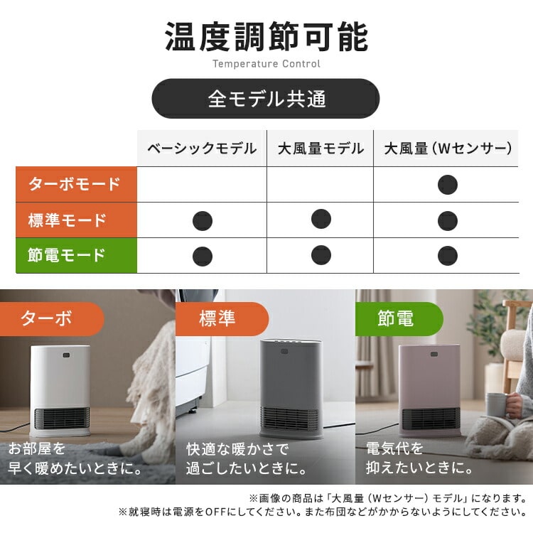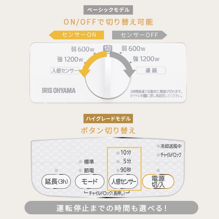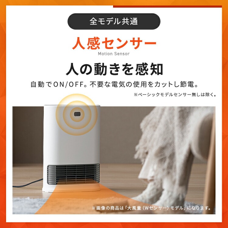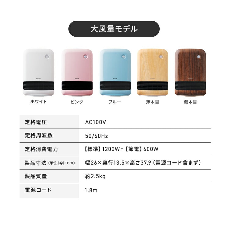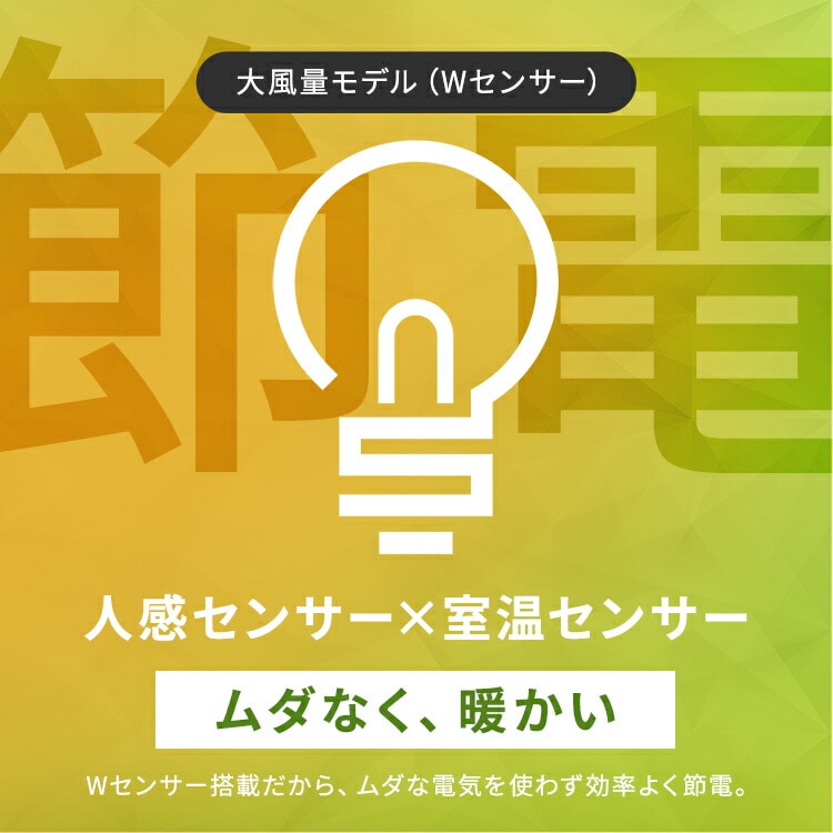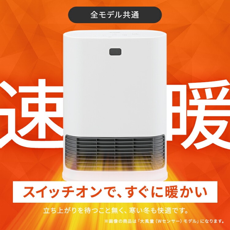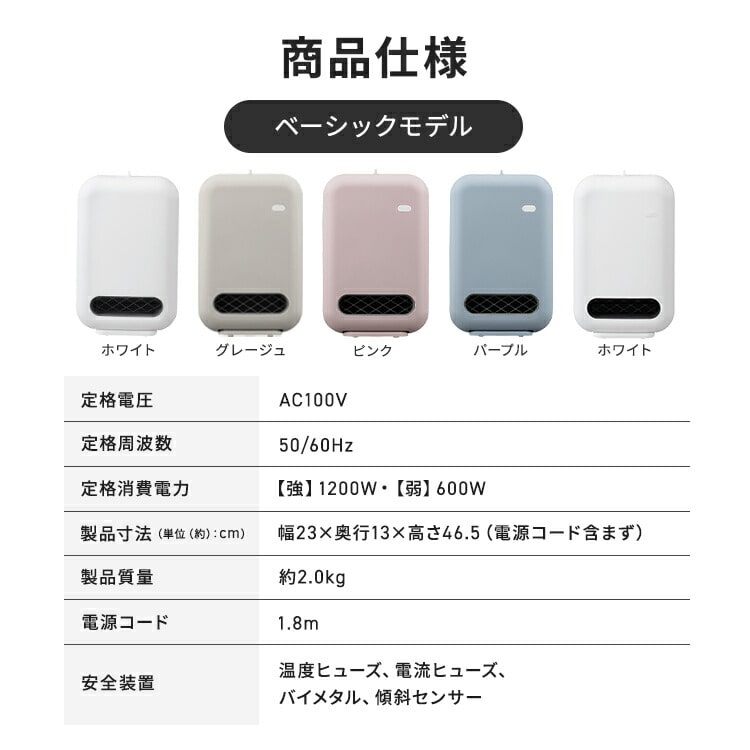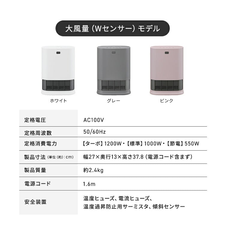 ●搭載機能人感センサー●定格電圧100V●定格周波数50/60Hz●運転ダイヤル600W/1200W●定格消費電力(50/60Hz)600W:630/600W1200W:1250/1150W●製品寸法(cm)幅約23×奥行約13×高さ約36(電源コード含まず)●製品重量約2kg●電源コード長さ約1.6m●安全装置温度ヒューズ、電流ヒューズ、バイメタル、傾斜センサー●人感センサー検知エリア左右:約90°内上下:約60°内距離:約2m内