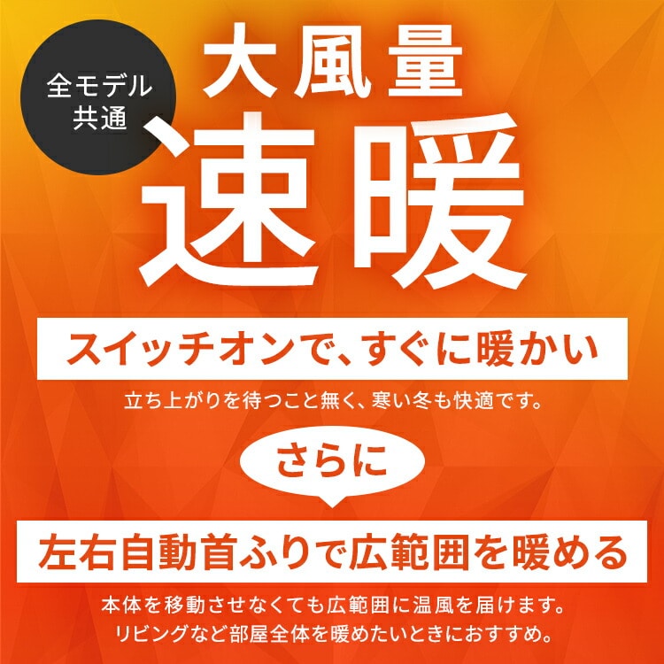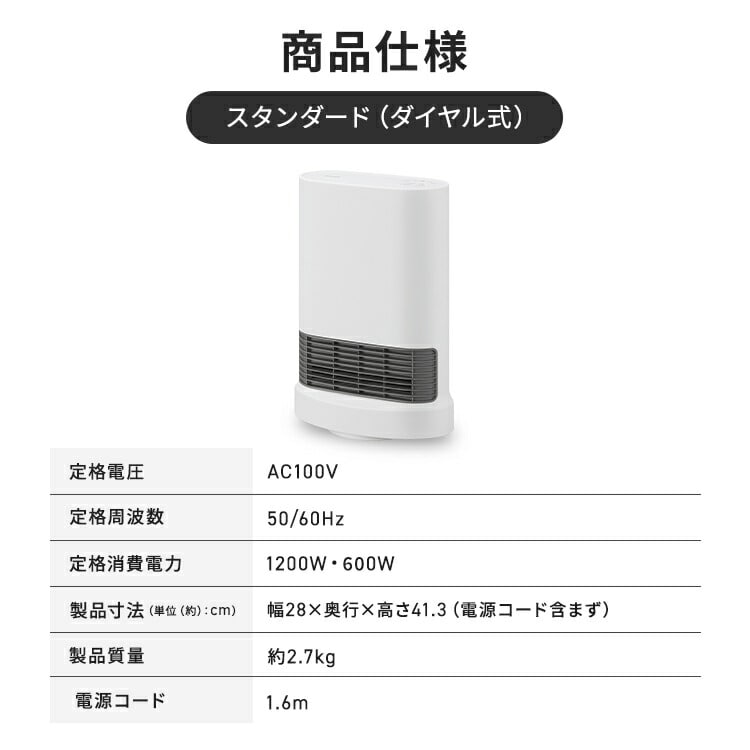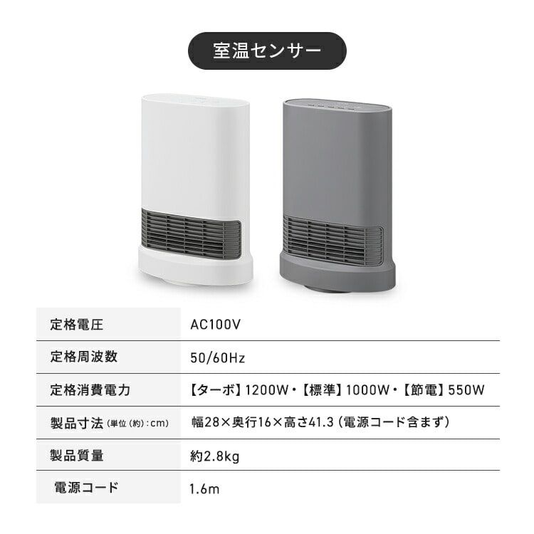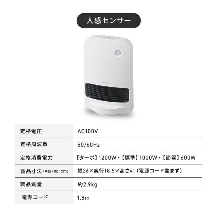 ●搭載機能首ふり/室温センサー●定格電圧100V●定格周波数50/60Hz●運転モードターボ/標準/節電●定格消費電力ターボ:1200W標準:1000W節電:550W●製品寸法(cm)幅約28×奥行約16×高さ約41.3(電源コード含まず)●製品重量約2.8kg●電源コード長さ約1.6m●安全装置温度ヒューズ、電流ヒューズ、温度過昇防止用サーミスタ、傾斜センサー
