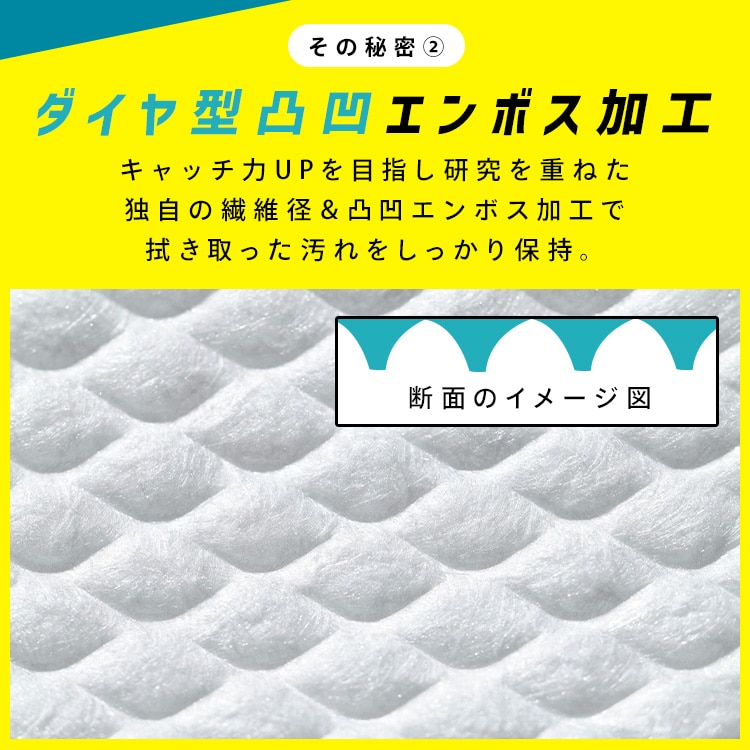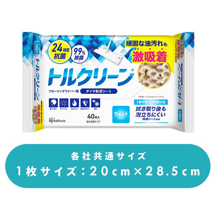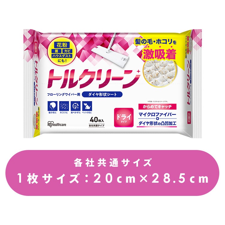 ※2024年12月20日 下記商品を追加/統合しました。 ドライ 20枚 DN-FD201P ウェット 20枚 DN-FW201P ドライタイプの商品説明です 髪の毛・ホコリを激吸着! フローリングワイパー用ダイヤ形状シート【ドライタイプ】です。 髪の毛に、ホコリに、食べかすに、ペットの毛に、ハウスダストに、花粉に、菌・カビに。 各社共通タイプ。 ◆マイクロファイバー マイクロファイバーを用いた特殊ポリプロピレンシートだから、髪の毛・ホコリが吸い付くように拭き取れる。 抜けやすいペットの毛もしっかりキャッチ! ◆ダイヤ形状の凸凹加工 キャッチ力UPを目指し研究を重ねた独自の繊維径&凹凸エンボス加工でふき取った汚れをしっかり保持。 ◆ドライシートだから床がベタつかない シート自体が乾いているから、掃除後も床がベタつかない。 手軽に毎日の掃除をしたい人におすすめ。 【使用方法】 1.表面のミシン目より開け、シートを1枚ずつ取り出してください。 2.お手持ちのフローリングワイパーに取り付けてご使用ください。 3.床面に強く押し付けず、すべらせるようにしてご使用ください。 汚れたり、ホコリが取れにくくなったら新しいシートに交換してください。 (使用の目安は、シート1枚で6畳のお部屋を10~12回程度です) ※アイリスオーヤマ調べ ●品名 住宅用掃除シート ●シート材質 ポリプロピレン ●シート寸法(cm) 幅約20×奥行約28.5 ●枚数 20枚 ●包材材質 外袋:PP ●使用用途 床(フローリング、ビニール)・壁・畳・天井・階段・家具・戸棚・電気製品 ●使用できないもの テレビ・パソコンなどの画面 ※用途以外には使用しないでください。 ※シートは吸収性がないので、ぬれた所には使用しないでください。 ※シートは水に溶けませんので、トイレなどに流さないでください。 ウェットタイプの商品説明です 頑固な油汚れも激吸着! フローリングワイパー用ダイヤ形状シート【ウェットタイプ】です。 拭き取り後も泡立ちにくい特殊シート採用。 髪の毛に、ホコリに、ハウスダストに、菌・カビに、油汚れに、皮脂汚れに、こびりつきに、花粉に。 各社共通タイプ。 ◆油汚れをスッキリ拭き取るポリプロピレン不織布を採用 油を効率的に吸収する特性を持つポリプロピレンの繊維。 耐久性に優れ汚れをスッキリ拭き取る。 ◆ダイヤ形状の凸凹加工 キャッチ力UPを目指し研究を重ねた独自の繊維径&凹凸エンボス加工でふき取った汚れをしっかり保持。 ◆24時間抗菌 ※1・99%除菌 ※2 サッとひと拭きで除菌・抗菌! いつでも衛生的な環境へ。 ※1 抗菌性はJIS Z 2801に準じて行われた試験の結果に基づく拭き取り後の評価。全ての菌の増殖を抑制するわけではありません。 ※2 ウェットワイパー類の除菌性能試験方法に準ずる試験による。全ての菌を除菌できるわけではありません。 【使用方法】 1.表面のラベルシールより開け、シートを1枚ずつ取り出してください。 2.お手持ちのフローリングワイパーに取り付けてご使用ください。 3.床面に強く押し付けず、すべらせるようにしてご使用ください。 使用中、床に液がつかなくても、シートにしめり気があれば汚れが取れます。 こびりつき汚れやシミはフローリングワイパー本体を使用せず、シートで直接拭いてください。 使用の目安は、シート1枚で約15~20畳です。(※アイリスオーヤマ調べ) 洗浄液が適量出るので、床をいためずお掃除できます。 ●品名 住宅用掃除シート ●成分 水、エタノール、界面活性剤、除菌剤 ●シート材質 ポリプロピレン ●液性 弱アルカリ性 ●シート寸法(cm) 幅約20×奥行約28.5 ●枚数 20枚 ●包材材質 外袋:PE、M、PET ラベルシール:PP ●使用用途 床(フローリング、ビニール)・壁・畳・網戸・玄関のたたき ●使用できないもの 窓・鏡・水拭きできないもの(水がしみ込む白木・家具・壁材等)・桐・うるし塗り・銅・しんちゅう製品・プラスチック製品・テレビ、パソコンなどの画面・天然石材 ※用途以外には使用しないでください。 ※シートは水に溶けませんので、トイレなどに流さないでください。