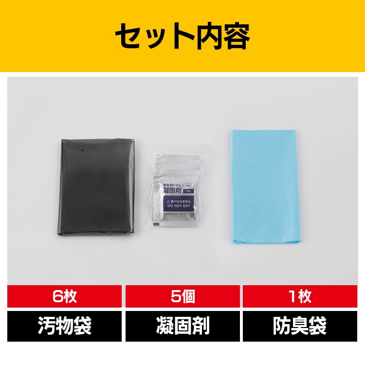 【商品説明】すぐに固まるから後処理がラクラク、超吸水非常用トイレ。たっぷり固める、凝固ポリマー[15g]!約5回分をまとめて廃棄できる“7層構造&特殊フィルム”防臭袋付き。◆超吸水:約2倍の吸水量(※1)◆抗菌:安心の99%抗菌(※2)◆消臭:ニオイ吸着&アンモニア99%消臭(※3)◆約15年間保存可能(※4)※1:アイリスオーヤマ従来品比。※2:JIS S0252 2021に準じて行われた試験結果です。複数菌種において99%以上の抗菌効果があることを確認しています。全ての菌の増殖を抑制するわけではありません。※3:アイリスオーヤマ調べ。アンモニアを滴下し、30分後99%以上脱臭することを確認しています。※4:未使用、未開封の場合。【使用方法】1:便座を上げ、便器に汚物袋を1枚かぶせる(便器カバー用)。2:便座の上に汚物袋をもう1枚かぶせる(排泄用)。3:排泄後、凝固剤(1回分)をふりかける。4:排泄用袋を取り出し、開口部を結ぶ。その後防臭袋に入れ(※)、廃棄する。(※目安:防臭袋1枚につき5回分。)【商品仕様】●セット内容凝固剤×5、汚物袋×6、防臭袋×1(5回分)●商品サイズ(cm)幅約15.5×奥行約1×高さ約22(※パッケージ)●商品重量約170g(※パッケージ)●材質凝固剤:ポリマー、抗菌剤汚物袋、防臭袋:PE
