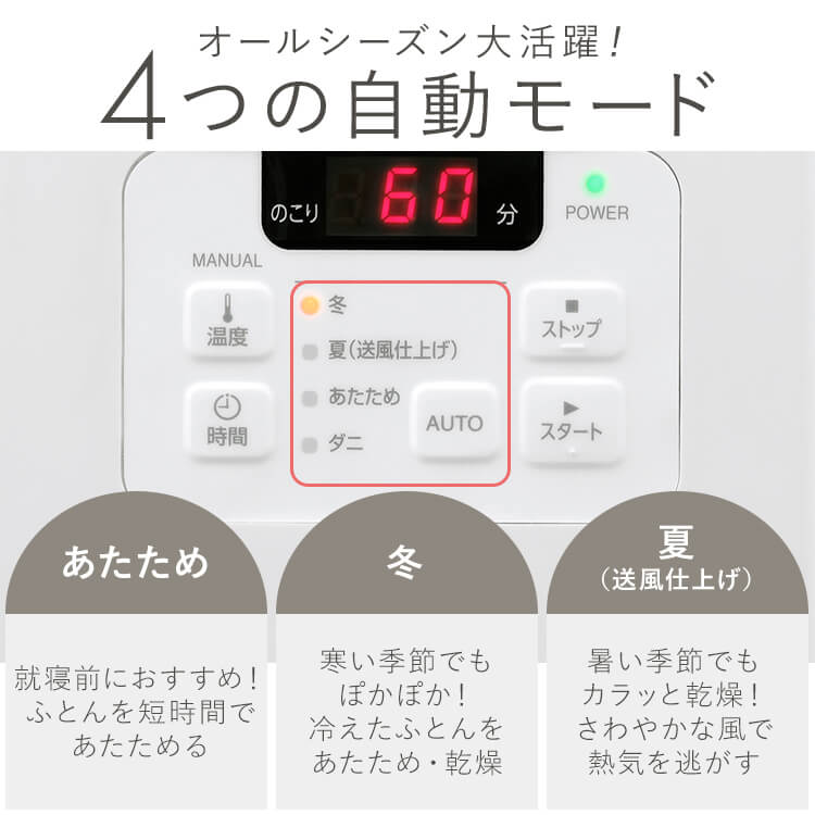 ・冬モード:寒い季節でもぽかぽか!冷えたふとんをあたため、乾燥。