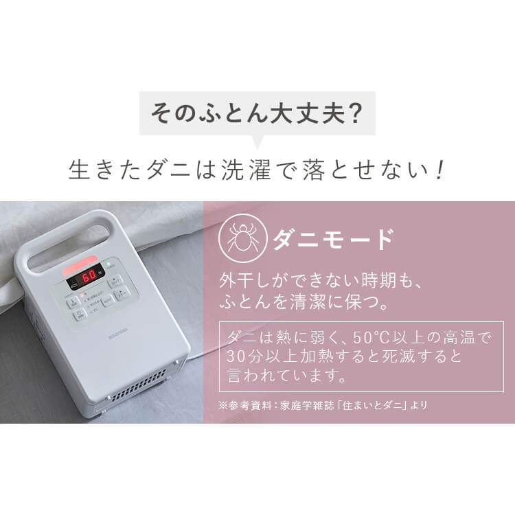 ・ダニモード:外干しができない時期もふとんを清潔に保つ。[ダニは熱に弱く、50℃以上の高温で30分以上加熱すると死滅すると言われています。※参考資料:家庭学雑誌「住まいとダニ」より。]