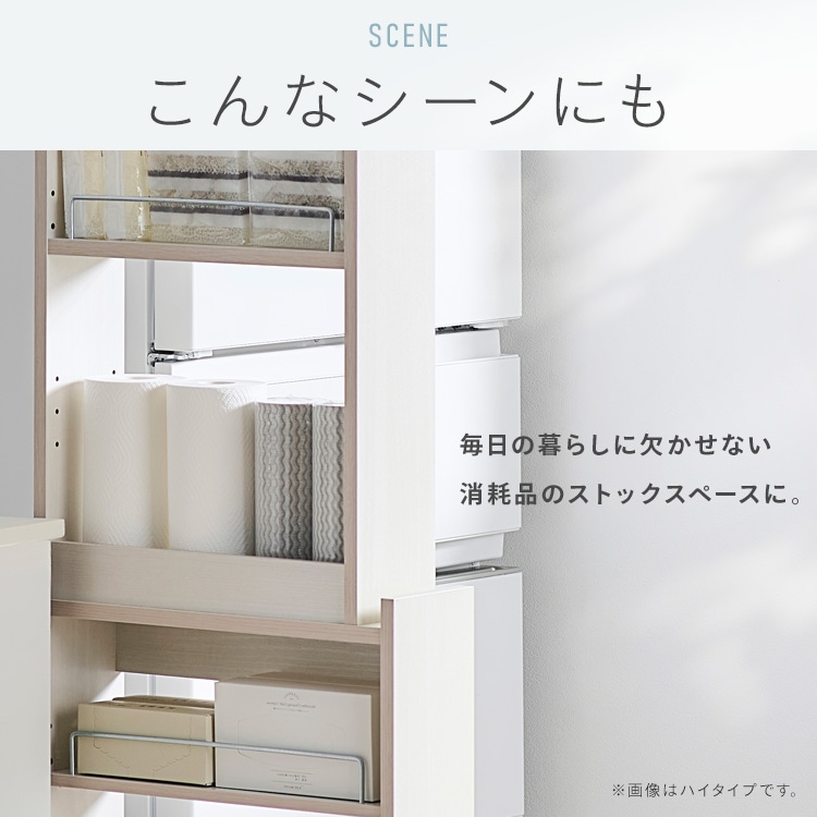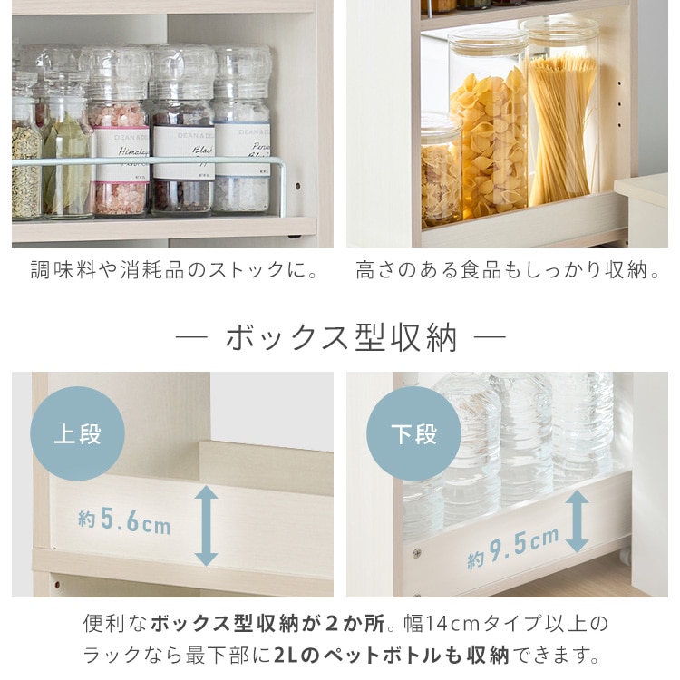 【商品説明】“幅10cm”以上の隙間があれば簡単に収納スペースが作れる、隙間収納ラック[ハイタイプ(幅:約10/12/14cm)]です。取っ手がラックと一体化したデザインなので見た目もスッキリしており、狭い場所でも邪魔になりません。キャスター付きで簡単に動かすことができるので、奥に入れた物も取り出しやすいです。高さが変えられる(2段階)可動棚付きなので、収納したい物に合わせて高さを調節できます。便利なボックス型収納が2か所あり、“幅14cm以上”のラックなら最下部に2Lのペットボトルも収納できます。消耗品のストックやデスク周りなど、キッチン以外にも空間・隙間の有効活用におすすめです。★お客様組立★【商品仕様】●商品サイズ(cm)10cm:幅約10×奥行約44.5×高さ約18112cm:幅約11.8×奥行約44.5×高さ約18114cm:幅約14×奥行約44.5×高さ約181●商品質量10cm:約10.3kg12cm:約11.5kg14cm:約13kg●耐荷重全体:約30kg固定棚:約5kg可動棚:約3kg底板:約8kg※耐荷重は測定値であり、保証値ではありません。●主要材質木製部分:プリント紙化粧パーティクルボード、合成樹脂化粧パーティクルボード(メラミン樹脂)金属部分:金属(鋼/ユニクロメッキ)●必要工具・プラスドライバー(サイズ:2番)・電動ドライバー使用可※インパクトドライバーは使用しないでください。※2人での組み立てをおすすめします。