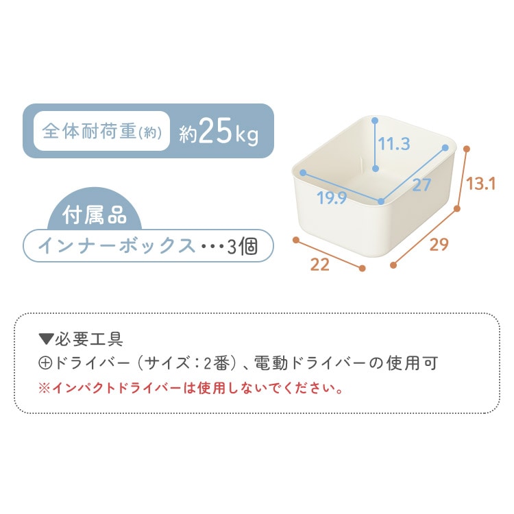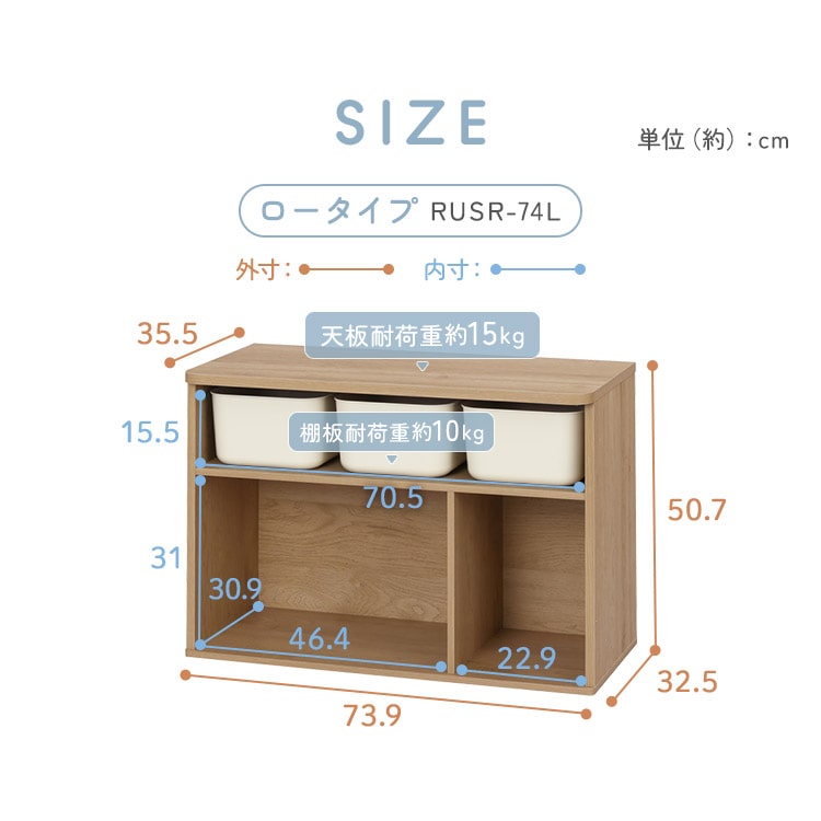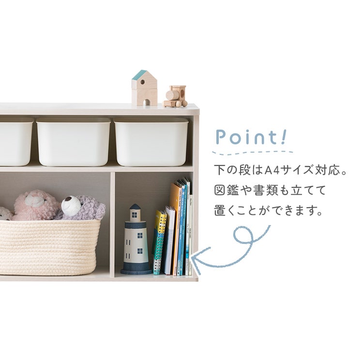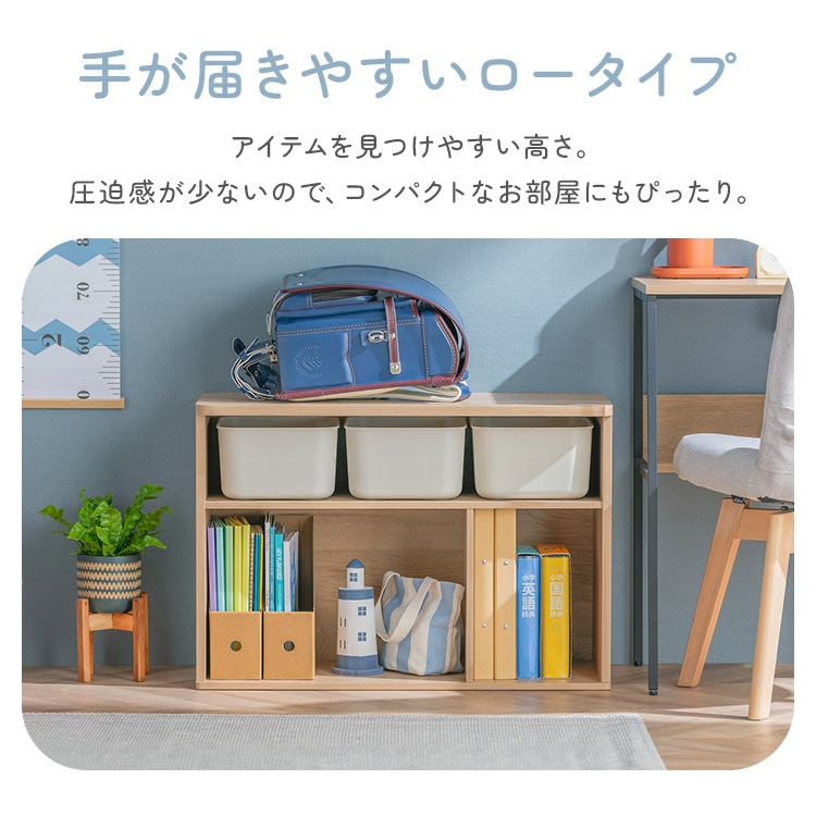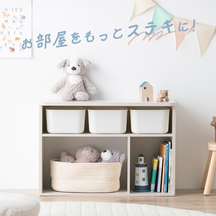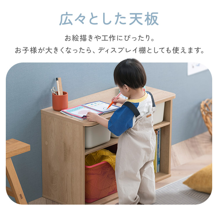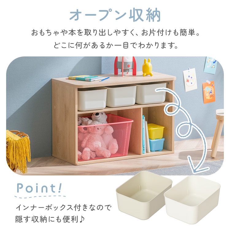 【商品説明】家族みんなが安心できる、角丸デザイン。 インナーボックス付き、ラウンドシェルフ。 君のお部屋はどっちカラー? ナチュラルベージュorホワイト。 おもちゃや本をすっきり整頓できるだけでなく、お絵描きや工作などにも使えるマルチな収納棚。 お部屋をもっとステキに! ◆オープン収納 おもちゃや本を取り出しやすく、お片付けも簡単。 どこに何があるか一目でわかります。 Point! インナーボックス付きなので隠す収納にも便利♪ ◆手が届きやすいロータイプ アイテムを見つけやすい高さ。 圧迫感が少ないので、コンパクトなお部屋にもぴったり。 Point! 下の段はA4サイズ対応。 図鑑や書類も立てて置くことができます。 ◆広々とした天板 お絵描きや工作にぴったり。 お子様が大きくなったら、ディスプレイ棚としても使えます。 ◆インテリアにもなじむデザイン 子供部屋以外に、リビングなどにもなじむデザイン。 どんな場所でも、長くお使いいただけます。 ◆安全設計 角が丸く設計されているので、家族みんなが安心して使用できます。 ★お客様組立★ 必要工具:+ドライバー(サイズ:2番) 電動ドライバーの使用可。(インパクトドライバーは使用しないでください。) 2人での組み立てをおすすめします。 ●商品サイズ(cm) 本体:幅約73.9×奥行約35.5×高さ約50.7 インナーボックス:幅約22×奥行約29×高さ約13.1 ●質量 本体:約11kg ●耐荷重 天板:約15kg、固定棚板:約10kg、全体:約25kg ●主要材質 木製部分:プリント紙化粧パーティクルボード、プリント紙化粧繊維板 ボックス:ポリプロピレン ●付属品 インナーボックス×3個 ●カラー ナチュラル/ライトベージュ、ホワイト ※耐荷重は測定値であり、保証値ではありません。