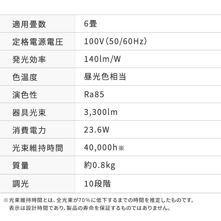 【商品説明】無理のない節電が、ていねいな暮らしに繋がる。◆LEDに換えるだけで電気代が約半分に!蛍光灯とLEDシーリングライト10年間の電気代比較。10年間で約27649円お得。※電気料金は1日5.5時間使用した場合で計算。電気料金目安単価31円/kWh(税込)で算出。※丸型蛍光灯72形(消費電力:68W)と7.0シリーズ6畳用(消費電力:23.6W)を比較。◆さらに7.0シリーズなら!「節電モード」と「効率よく発光」の Wで節電1.節電モードで節電30分かけて明るさを徐々に落とし、気付かないうちに節電。※ゆっくり明るさが変わる場合、人間の目は変わっていく明るさに順応し変化を感じない性質があります。2.効率よく発光アイリスオーヤマ独自の技術で、明るさはそのままに高い省エネ性能を実現。◆工具不要で簡単2STEP取付お使いの照明と取り替えるだけ。1.ガチャっと回す2.シェードを付ける天井に下記の配線器具が付いていれば、すぐに取り付けできます。角型引掛シーリング丸型引掛シーリング丸型フル引掛シーリングフル引掛ローゼット ※天井からの出しろ:20mm以上、24mm未満埋込ローゼット(耳つき)(耳なし) ※天井からの出しろ:10mm以上、14mm未満◆明るさ切り替え10段階様々なシーンに合わせて調節できる。デスクワーク、くつろぎの時間、就寝◆より自然に見えるRa85演色性が高いほど、肌や食べ物の色がより美しく自然に見えます。住宅の屋内照明の場合、Ra80以上が好ましいとされています。◆便利なポイントメモリ点灯機能:お好みの明るさを記憶して再点灯。おやすみタイマー:次第に暗くなり30分後に消灯。【商品仕様】●商品サイズ(cm)直径約39.3×高さ約8.5●本体質量約0.81kg●適用畳数~6畳●型番CEP6D-7.0●色温度6500K(昼光色相当)●演色性Ra85●調光10段階●調色無し●ラストメモリー〇●壁スイッチ切替常夜灯→ラストメモリ点灯→全灯→●常夜灯明るさ2段階●おやすみタイマー30min●その他機能2CH切替、節電モード、デモモード●定格電圧AC100V●定格周波数50/60Hz●発光効率140Im/W●待機消費電力0.5W●使用環境温度5~35℃●光束維持時間40000h光束維持時間とは、全光束が70%に低下するまでの時間を推定したものです。表示は設計時間であり、製品の寿命を保証するものではありません。●定格消費電力23.6W●定格入力電流0.46A●器具光束(最大点灯時)3300lm●付属品・リモコン付属部品:リモコン、リモコンホルダー、単4形アルカリ乾電池×1本(お試し用)、タッピングネジ×2本・取り付け用付属品:スペーサー(角)(丸)●保証期間5年