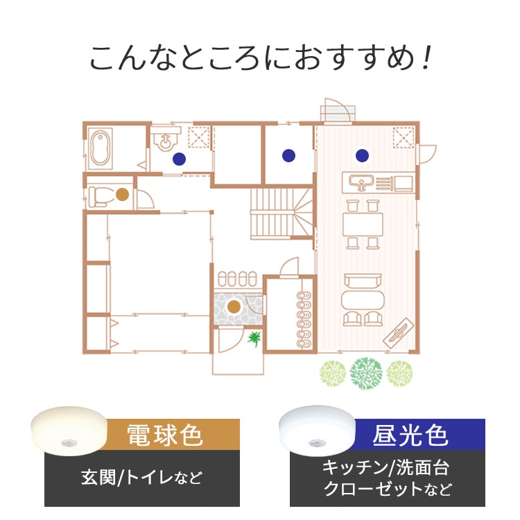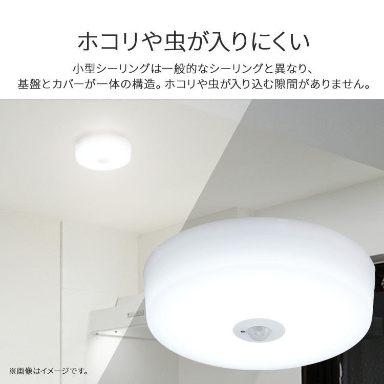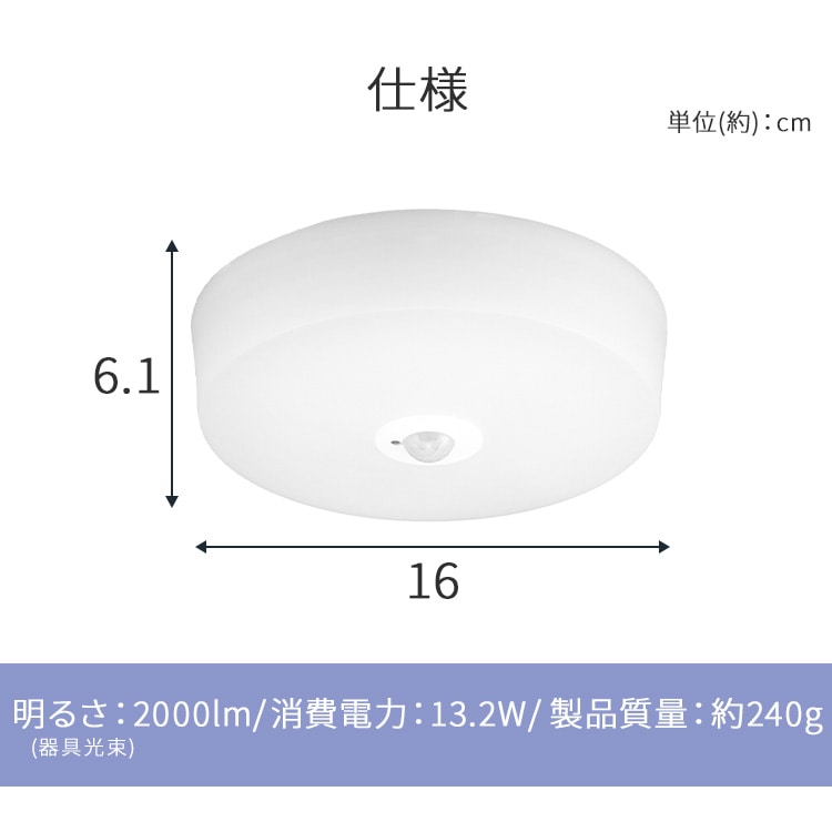 【商品説明】コンパクトでもしっかり明るいLED小型シーリングライトです。小型で場所を取らないので、トイレや洗面所、廊下やクローゼットなどの照明におすすめです。人を感知して自動でON/OFFになる人感センサー付きです。色がより自然に見える「演色性:Ra80以上」です。同じ明るさの白熱灯と比べて消費電力が小さく、電気代を節約できます。基盤とカバーが一体となる構造のため、ホコリや虫が入りにくいです。電気工事・工具不要で取り付けが簡単です。【商品仕様】●商品サイズ(cm)直径約16×高さ約6.1●質量約240g●器具光束2000lm●色温度電球色:3000K昼光色:6500K●定格電圧、周波数AC100V、50/60Hz●定格消費電力13.2W●待機消費電力0.5W●定格入力電流0.21A●演色性Ra85●点灯照度100lx以下●検知範囲(2.4mの天井で)直進:半径約1.5m横切り:半径約2.5m●点灯時間90秒●設計寿命40000時間※LEDモジュールの設計寿命は、LEDが点灯しなくなるか初期光束の70%に低下するまでの総点灯時間のいずれか短い時間を推定したものです。製品の寿命を保証するものではありません。