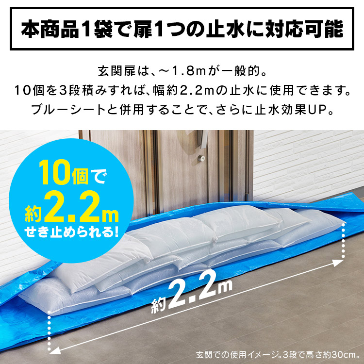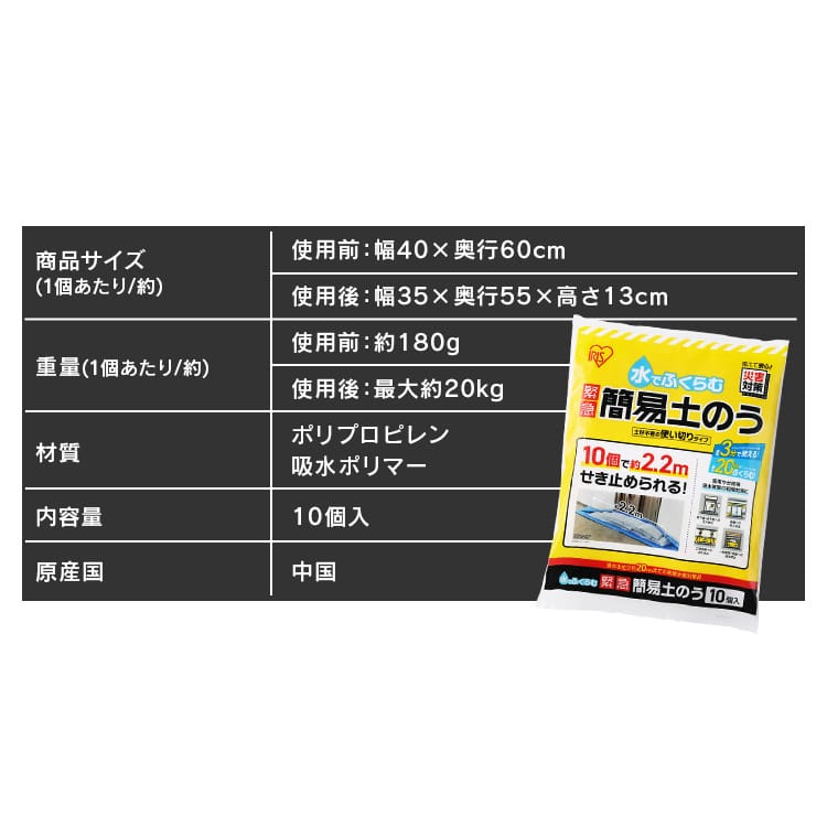 土嚢 土のう 10個入 水で膨らむ 土砂不要 最短3分 最大20kg 玄関 ガレージ 排水溝 約2.2m せき止める 大雨 豪雨 台風 水害 浸水対策 防災 防災用品 土嚢袋 緊急 簡易土のう 使い切り アイリスオーヤマ MKD-10 * [new08]
