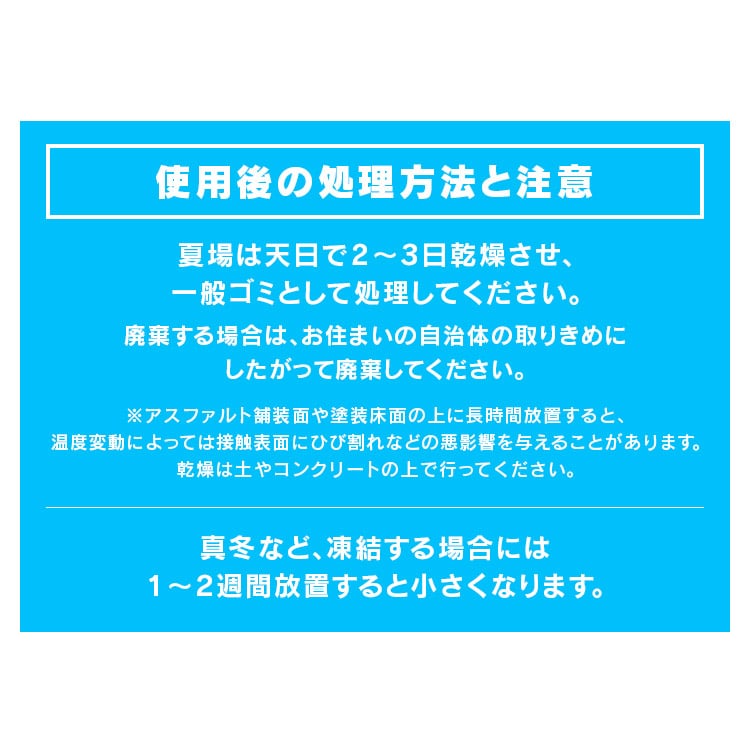 ※使用後は天日で2~3日乾燥させれば、一般ゴミとして処理できます。処理方法は各自治体のルールをご確認の上、従ってください。