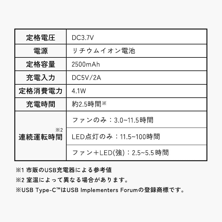 【商品仕様】【クリップ式】●定格電圧DC3.7V●電源リチウムイオン電池●定格容量2500mAh●充電入力DC5V / 2A●充電時間約2.5時間※1●最小運転時間約2.5時間※2●定格消費電力4.1W●製品寸法(cm)幅約15.9×奥行約7.4×高さ約19●製品質量約0.37kg●付属品USBケーブル(Type-C/Type-A)×1、アロマパッド×3※1 市販のUSB充電器による参考値※2 風量(強)、LEDライト(強)の時 室温によって異なる場合があります。【ベルト式】●定格電圧DC3.7V●電源リチウムイオン電池●定格容量2500mAh●充電入力DC5V / 2A●充電時間約2.5時間※1●最小運転時間約2.5時間※2●定格消費電力4.1W●製品寸法(cm)幅約15.2×奥行約6.8×高さ約17.6(ベルトを除く)●製品質量約0.27kg●付属品USBケーブル(Type-C/Type-A)×1、アロマパッド×3※1 市販のUSB充電器による参考値※2 風量(強)、LEDライト(強)の時 室温によって異なる場合があります。