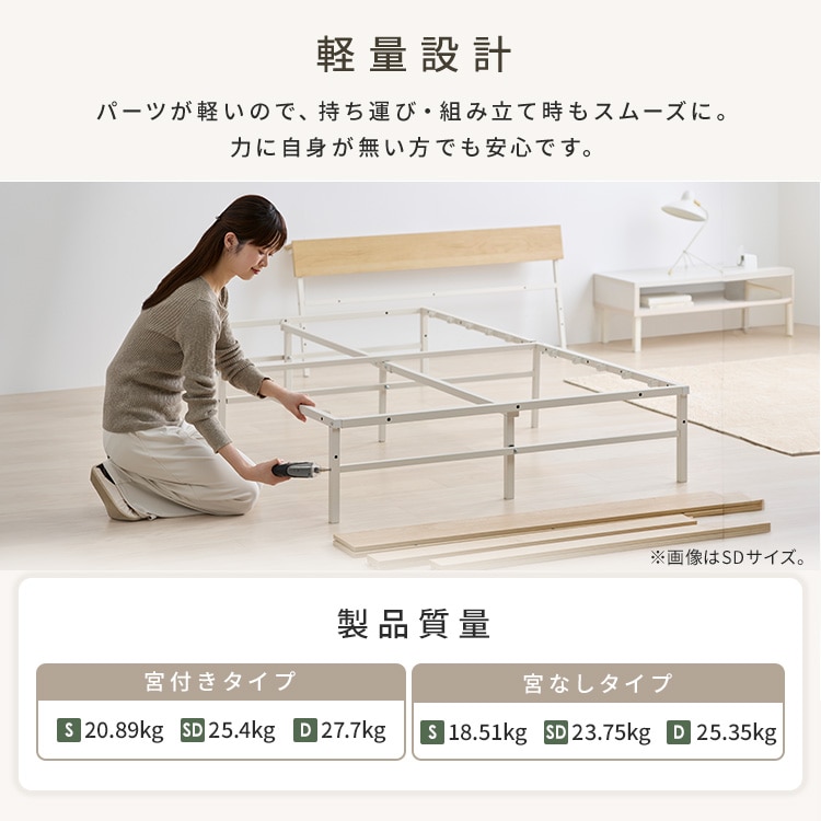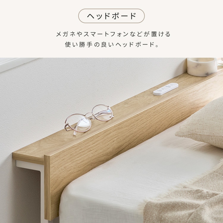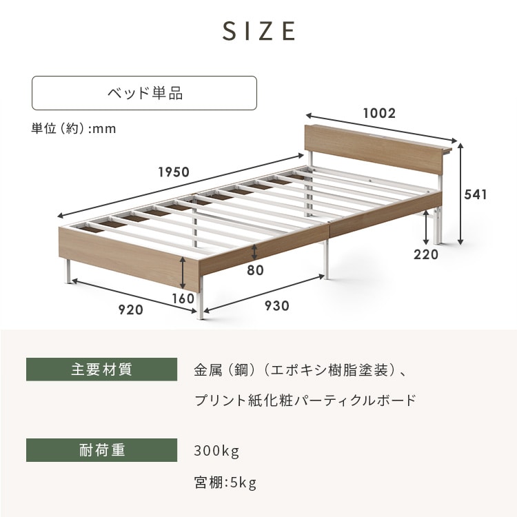 【商品説明】木製×スチールウッドスチールベッド【シングル】【宮付きタイプ】◆木製×スチール木製とスチールの上質なデザイン。木の温もりとスチールの無機質さがお部屋と調和します。◆優れた通気性マットレスや床との接着面はスチール製だから湿気がこもりにくく衛生的。◆安心の強度・品質安心して睡眠できるベッドフレームを実現しました。◆便利な収納[2口コンセント]スマートフォンの充電や間接照明の使用に最適。寝室をより快適空間へ。[ヘッドボード]メガネやスマートフォンなどが置ける使い勝手の良いヘッドボード。★お客様組立★【商品仕様】●商品サイズ(cm)幅約100.2×奥行約205.1×高さ約54.1●主要材質金属(鋼)(エポキシ樹脂塗装)、プリント紙化粧パーティクルボード●電源コード仕様定格電圧:AC100V定格周波数:50Hz/60Hz消費電力合計:1500Wまで●必要工具+ドライバー(サイズ:2番)電動ドライバーの使用可。※インパクトドライバーは使用しないでください。※2人での組み立てをおすすめします。