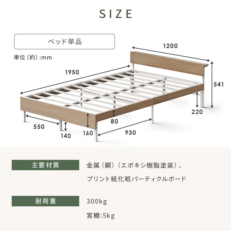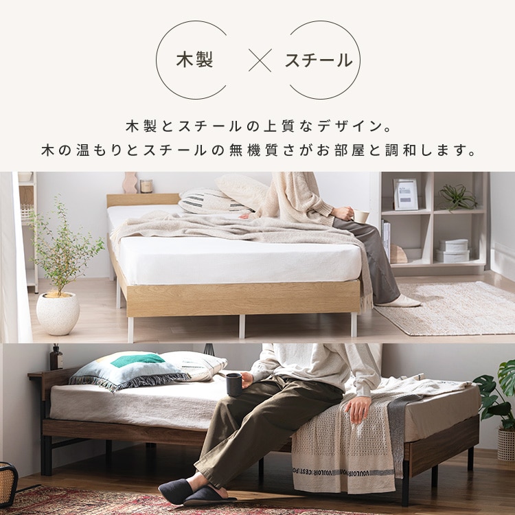 【商品説明】木製×スチールウッドスチールベッド【セミダブル】【宮付きタイプ】◆木製×スチール木製とスチールの上質なデザイン。木の温もりとスチールの無機質さがお部屋と調和します。◆優れた通気性マットレスや床との接着面はスチール製だから湿気がこもりにくく衛生的。◆安心の強度・品質安心して睡眠できるベッドフレームを実現しました。◆便利な収納[2口コンセント]スマートフォンの充電や間接照明の使用に最適。寝室をより快適空間へ。[ヘッドボード]メガネやスマートフォンなどが置ける使い勝手の良いヘッドボード。★お客様組立★【商品仕様】●商品サイズ(cm)幅約120×奥行約204.7×高さ約54.1●主要材質金属(鋼)(エポキシ樹脂塗装)、プリント紙化粧パーティクルボード●電源コード仕様定格電圧:AC100V定格周波数:50Hz/60Hz消費電力合計:1500Wまで●必要工具+ドライバー(サイズ:2番)電動ドライバーの使用可。※インパクトドライバーは使用しないでください。※2人での組み立てをおすすめします。
