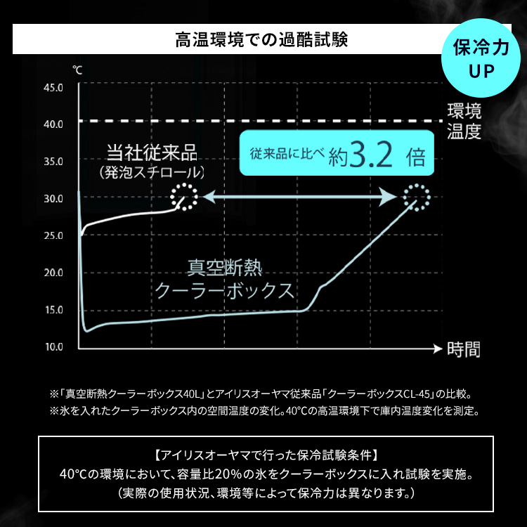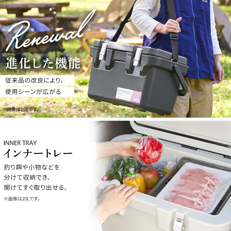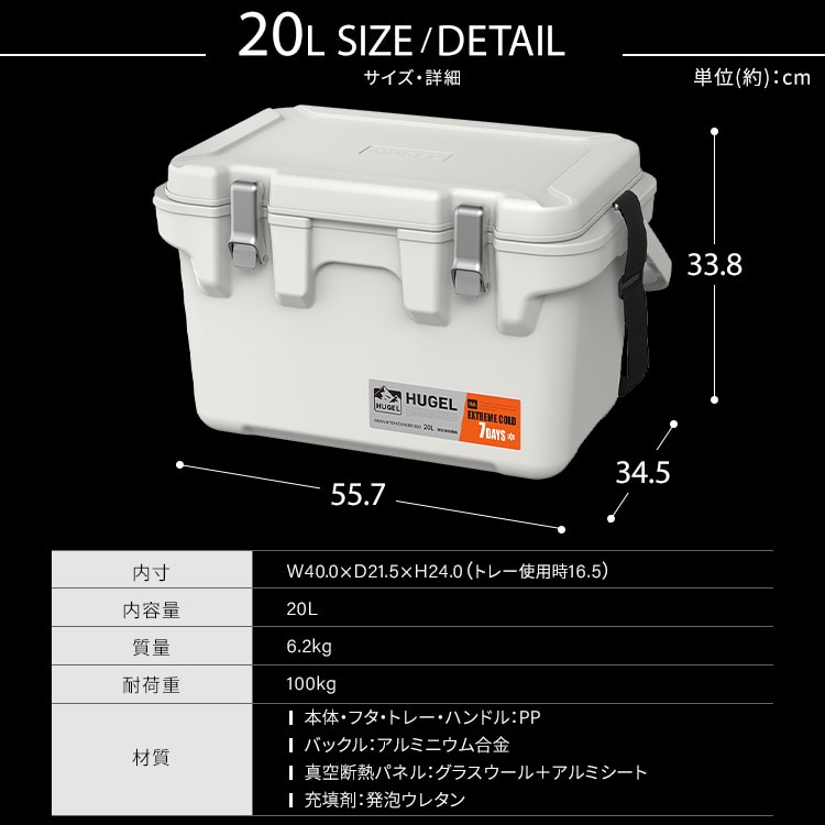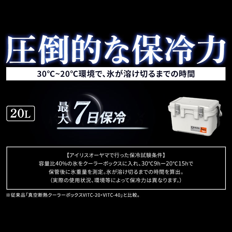 【商品説明】アウトドアで大活躍!最大7日の長時間高保冷タイプ※アイリスオーヤマ試験結果家電メーカーアイリスオーヤマだからこそ実現できた保冷力で、冷蔵庫の技術を利用した6面すべてに真空断熱パネルを採用しています。真空断熱パネルと発泡ウレタンの2つの断熱材を掛け合わせ高保冷力を実現しました。ハンドル・ショルダーベルト付きで持ち運びがラクに、片手が開くから機動力アップで移動もストレスフリーです。食材や小物などもすっきり仕分けるインナートレー付きです。ボックス内が整理できて快適です。※【保冷試験条件】容量比40%の氷をクーラーボックスに入れ、30℃9h-20℃15hで保管後に氷重量を測定。氷が溶け切るまでの時間を算出(アイリスオーヤマ試験結果)。 実際の使用状況、環境等によって保冷力は異なります。【商品仕様】●商品サイズ(cm)製品外寸:幅約55.7×奥行約34.5×高さ約33.8製品内寸:幅約40.0×奥行約21.5×高さ約24.0(トレー使用時16.5)●商品重量約6.22kg●容量約20L●材質本体・フタ・トレー・ハンドル:PPバックル:アルミニウム合金真空断熱パネル:グラスウール+アルミシート充填剤:発泡ウレタン●耐荷重約100kg※耐荷重は測定値であり、保証値ではありません。●収納の目安2Lペットボトル×4本 または、500mlペットボトル×20本 または、350ml缶×30本