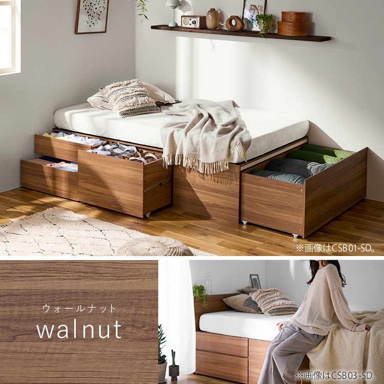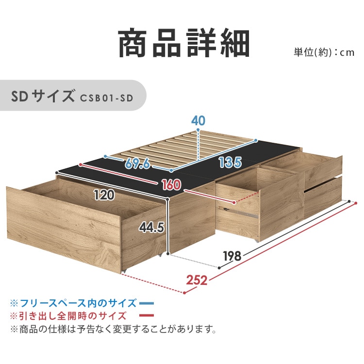 【商品説明】優れた収納力で暮らしを整えるベッドです。複数の引き出しで効率的に収納ができます。最小限でシンプルな機能を求める方におすすめな宮無しタイプです。取り出しに手間がかかるフリースペースを最小限に設計しています。また、床板のすのこは片面仕様で取り外しが簡単なので、収納物の出し入れもスムーズです。マットレスの滑りを防ぐ、滑り止めも付属しています。★お客様組立★【商品仕様】●型番CSB01-SD●製品サイズ(cm)幅約120×奥行約198×高さ約44.5(セミダブル)●製品重量約98.7kg●耐荷重(本体)約300kg※耐荷重は測定値であり、保証値ではありません。●主要材質合成樹脂化粧パーティクルボード(メラミン樹脂)、プリント紙化粧パーティクルボード、積層材、金属(鋼)●必要工具+ドライバー(サイズ:2番)※2人以上での組み立てをおすすめします。※インパクトドライバーは使用しないでください。破損するおそれがあります。