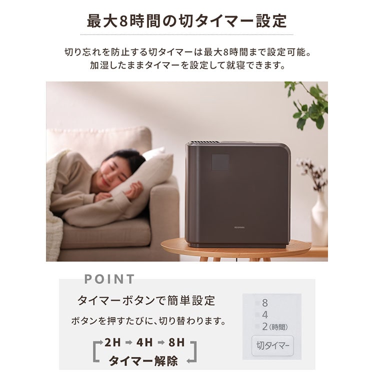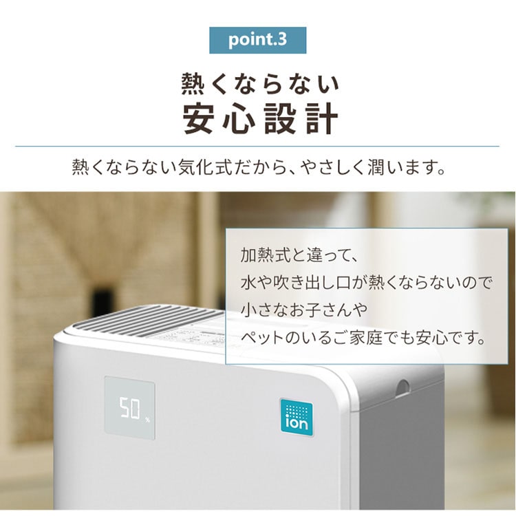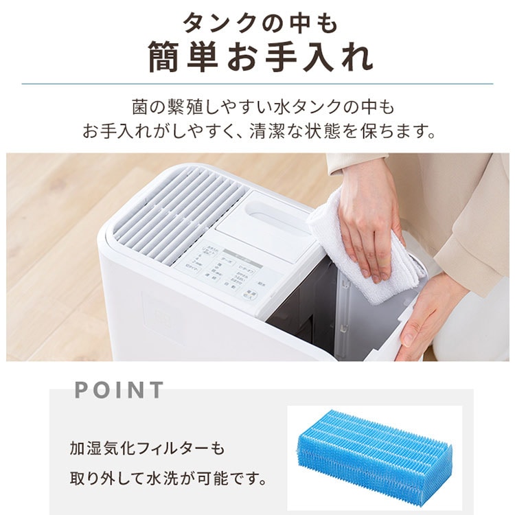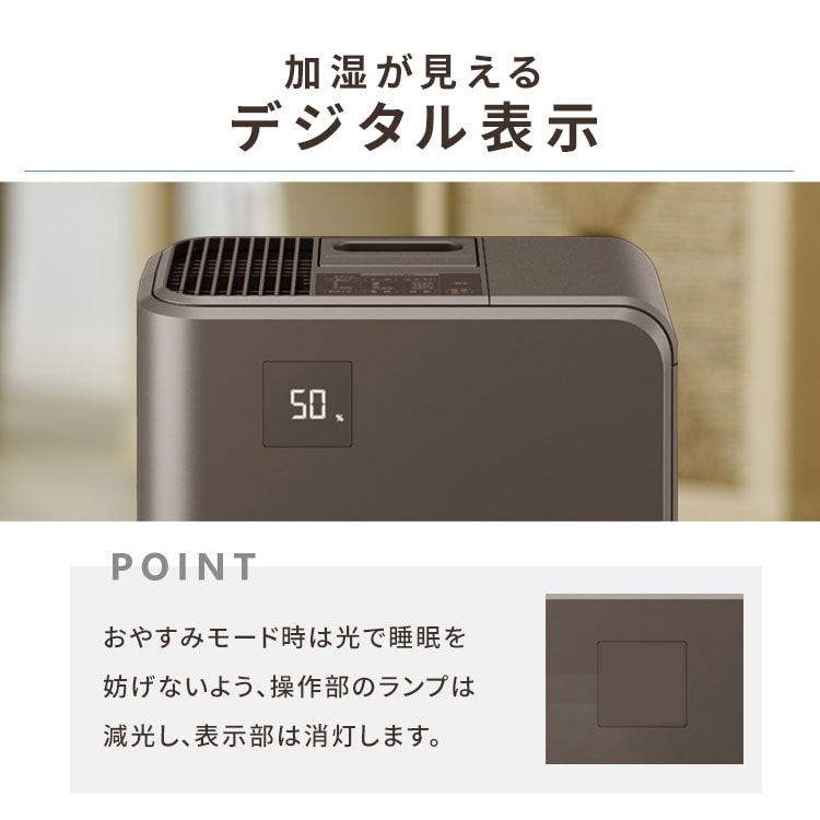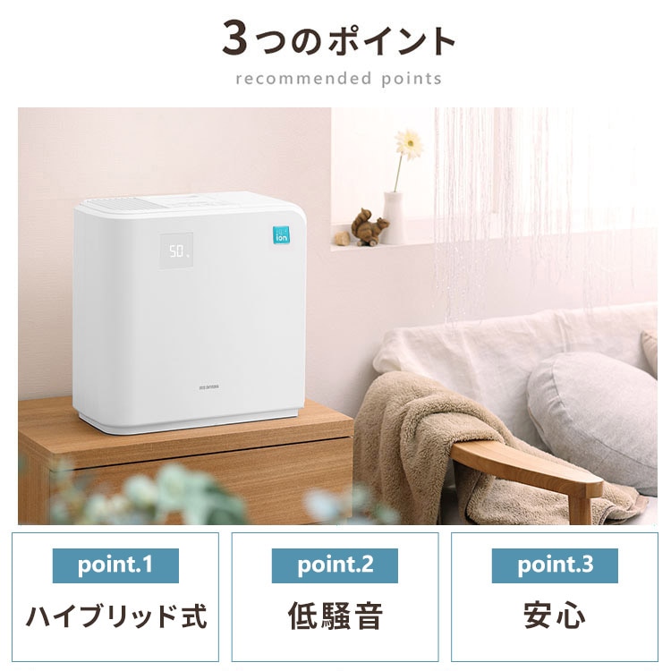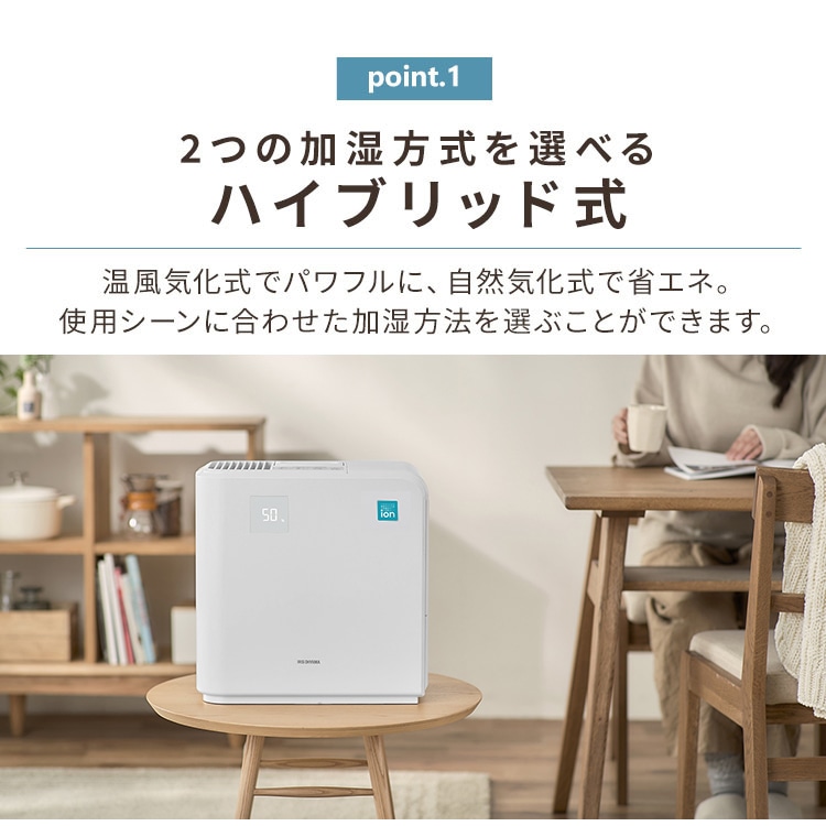 \2025年12月9日に商品ページをリニューアルしました。/静かにやさしく潤うハイブリッド式加湿器。「パワフル加湿」と「省エネ加湿」、二つの加湿方式で使用シーンに合わせた加湿方法を選べます。適切な40~60%の湿度はウイルス対策にも効果的です。静音だから加湿しながらも、眠りを妨げません。水や吹き出し口も熱くならないので小さなお子さんや、ペットのいる家庭でも安心です。