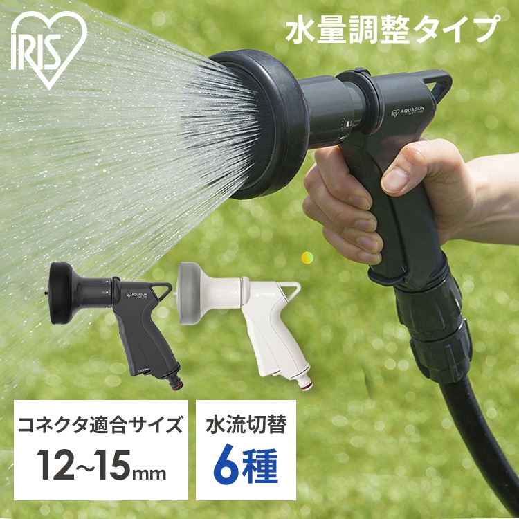 ワイドヘッドアクアガン AGFW-6[水量調整タイプ]フルカバーホースリールHG用アクアガンです。ロック機能付きです。用途に合わせて6つの噴射【キリ/カクサン/ジェット/シャワー/ジョーロ/ストップ】ができます。※お持ちのホースが直付けタイプの場合はコネクターが必要です。ご使用の際は、アイリスオーヤマ製耐圧ワンタッチコネクター(別売)をおすすめします。