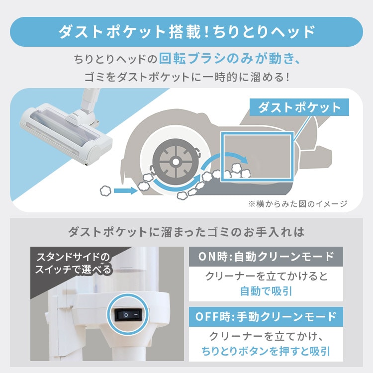 本体のモーターは動かさず、ヘッドのみでゴミをかき出す。