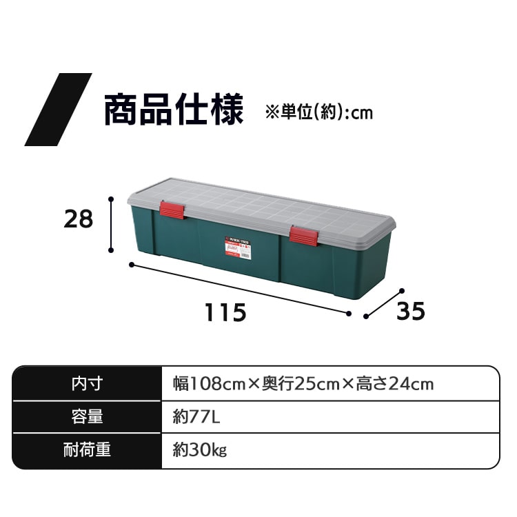●容量約77L●商品サイズ(cm)外寸:幅約115×奥行約35×高さ約28内寸:幅約108×奥行約25×高さ約24●商品重量約3.9kg●耐荷重約30kg※耐荷重は測定値であり、保証値ではありません。●材質ポリプロピレン※車載する場合は、お車のトランクのサイズを確認の上、お買い求めください。※ふたには耐荷重以上の荷重をかけないでください。※火のそばで使用したり、直射日光のもとで長時間放置しないでください。