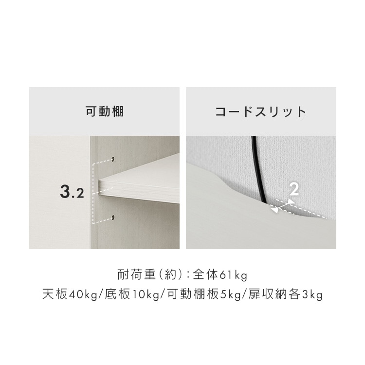 左右の扉付き収納はどちらもコード逃がし穴付き。