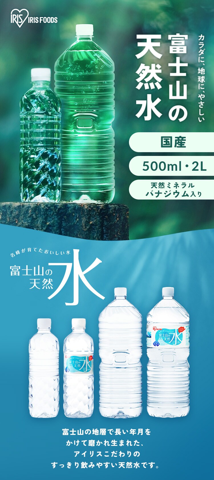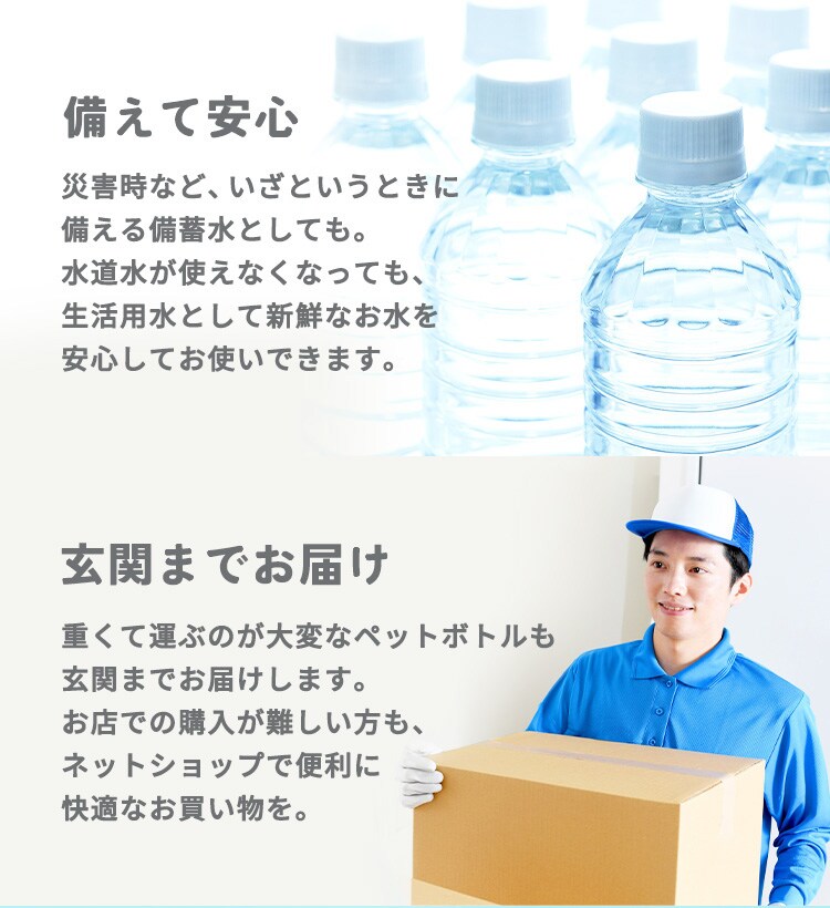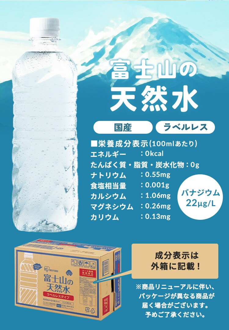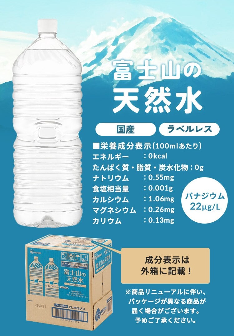 ●商品サイズ(cm)500ml:直径約6.55×高さ約21(1本あたり)2L:幅約10.4×奥行約92.8×高さ約30.8(1本あたり)●質量500ml:約540g(1本あたり)2L:約2,166g(1本あたり)●内容量500ml×24本500ml×48本(1ケース24本×2)2L×6本2L×9本2L×12本(1ケース6本×2)●品名ナチュラルミネラルウォーター●原材料名水(鉱水)●栄養成分表示(100ml当たり)エネルギー:0kcalたんぱく質・脂質・炭水化物:0gナトリウム:0.55mg食塩相当量:0.001gカルシウム:1.06mgマグネシウム:0.26mgカリウム:0.13mg