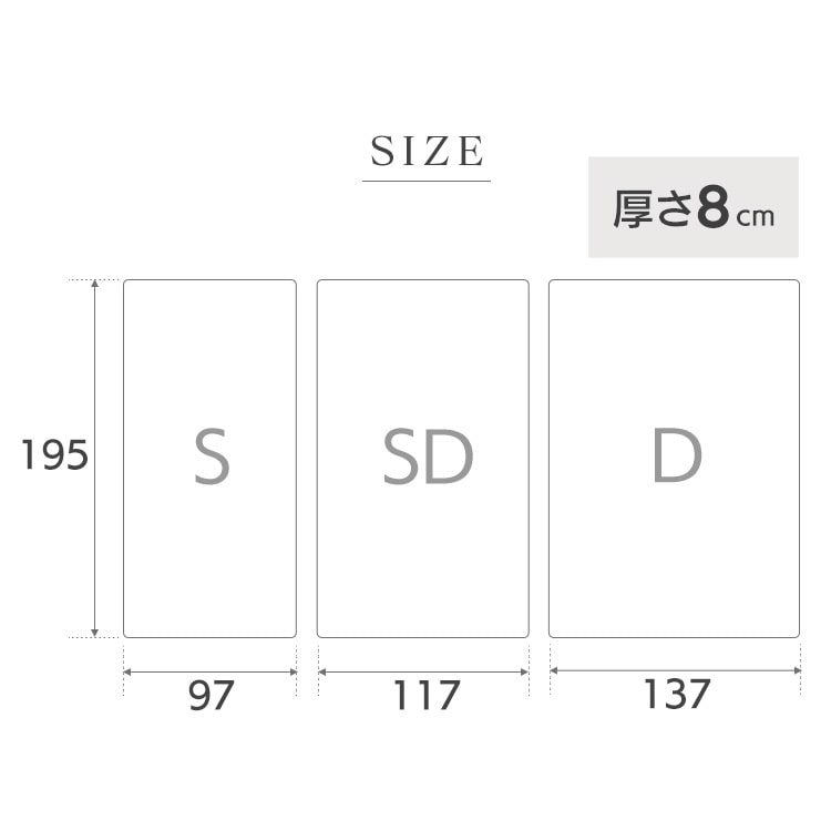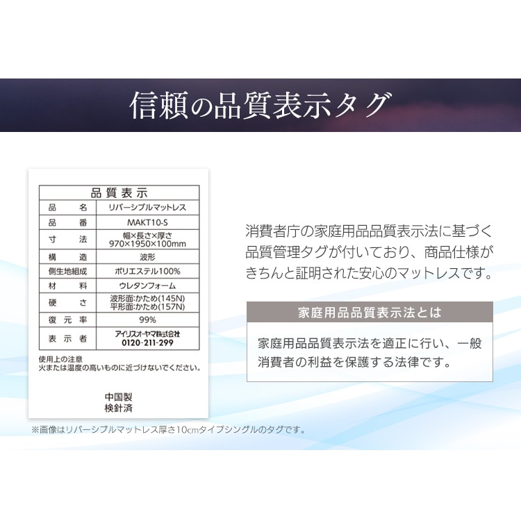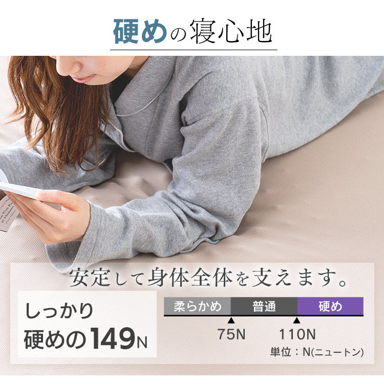 ●商品サイズ(cm)幅約97×奥行約195×高さ約8●商品質量約5kg●目付けニット:約145g/m2パイル:約170g/m2メッシュ:約190g/m2●マットレスの硬さかため(149N)●復元率約99%●構造一枚もの 波形●主要材質側生地:ポリエステル100%詰めもの:ウレタンフォーム※側生地のみ取り外して洗濯ができます。洗濯ネットをご使用ください。※詰め物のウレタン本体は劣化するおそれがありますので洗濯しないでください。