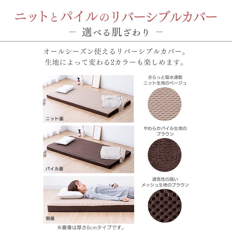 カバーは“パイル生地(ブラウン):やわらかな肌触り/吸水速乾生地(ベージュ):さらっと快適”のリバーシブル仕様。