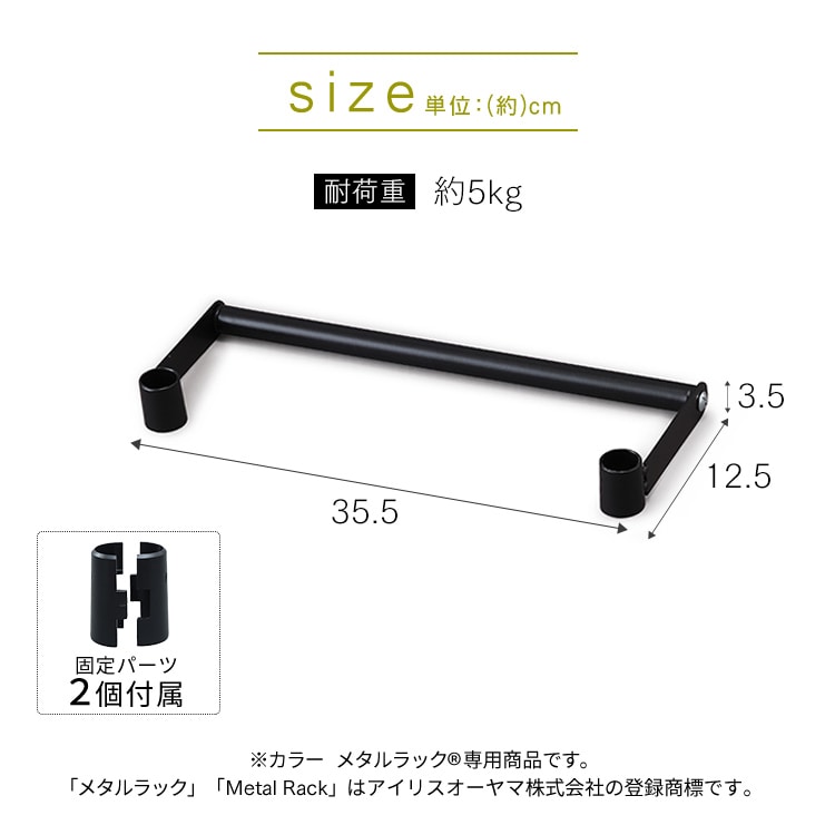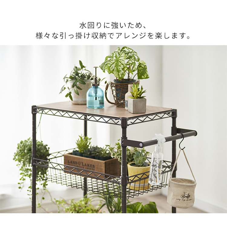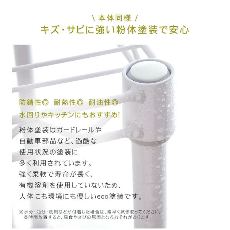 ラックサイドを有効活用。便利な引っ掛け収納に最適。タオルをかけたり、S字フック(別売り)を利用して掛ける収納をプラスオン。水回りに強いメタルラックだから観葉植物を並べてお部屋に緑をプラス。サイドハンガーを取り付けたい位置より上にある棚板を外し、ポールに棚板固定部品を取り付け、固定部品をおしこむようにサイドハンガーを取り付けます。