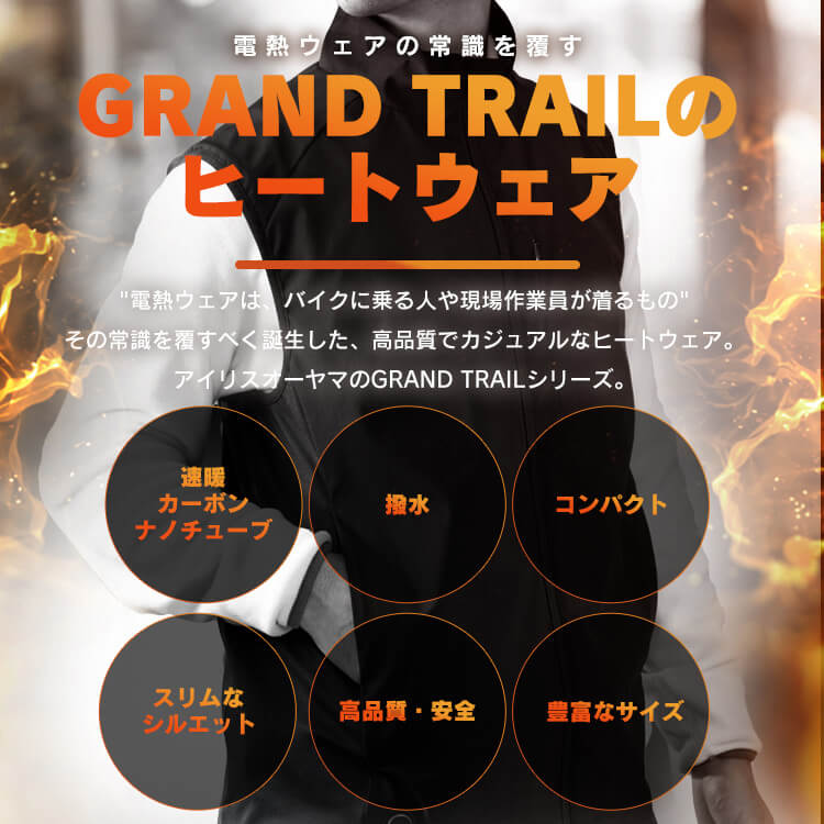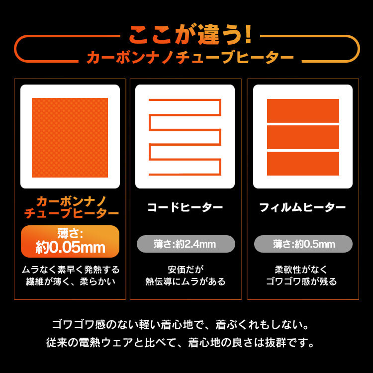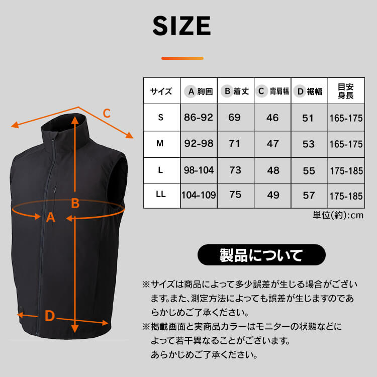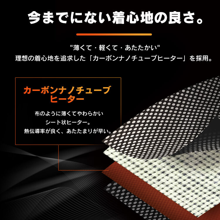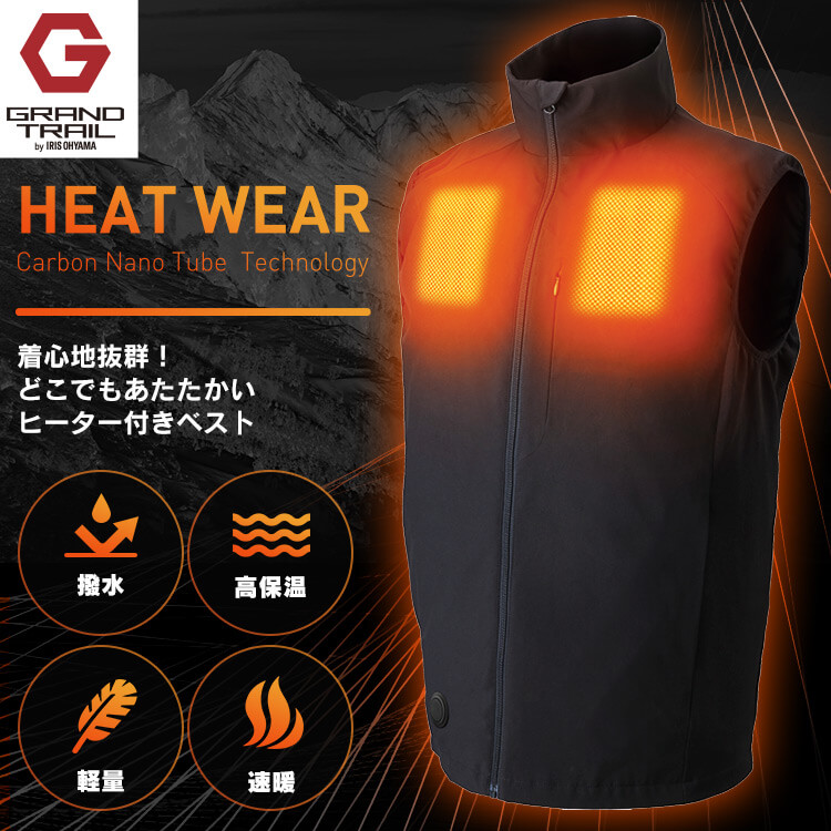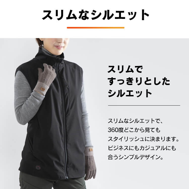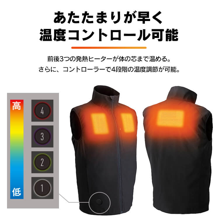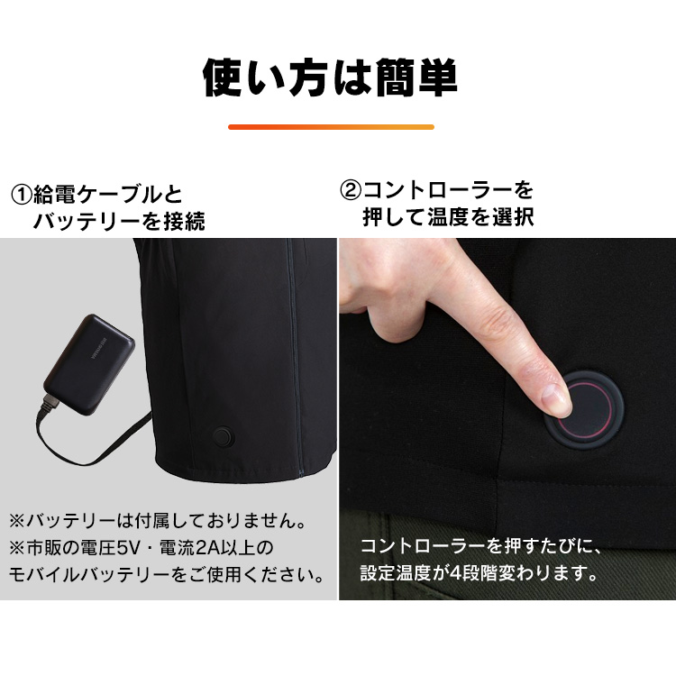 コンセントがない所でもあたたかいはっ水加工とヒーター付きベストです。シート状のヒーターのため、着心地を損なわずに着用できます。また、はっ水加工で水にも強く、レジャーやスポーツ観戦屋外での作業など様々なシーンで使用できます。[使い方]1.給電ケーブルとバッテリーを接続。2.コントローラーを押して温度を選択。(コントローラーを押すたびに、設定温度が4段階変わります)3.温度選択後すぐにあたたまります。※バッテリーは付属されていません。※市販の電圧5V・電流2A以上のモバイルバッテリーをご使用ください。