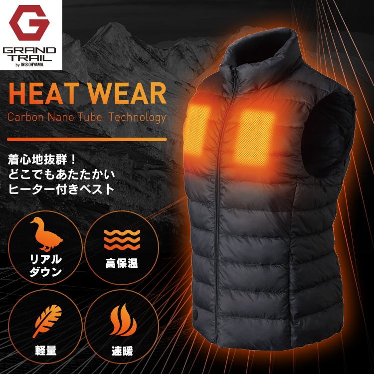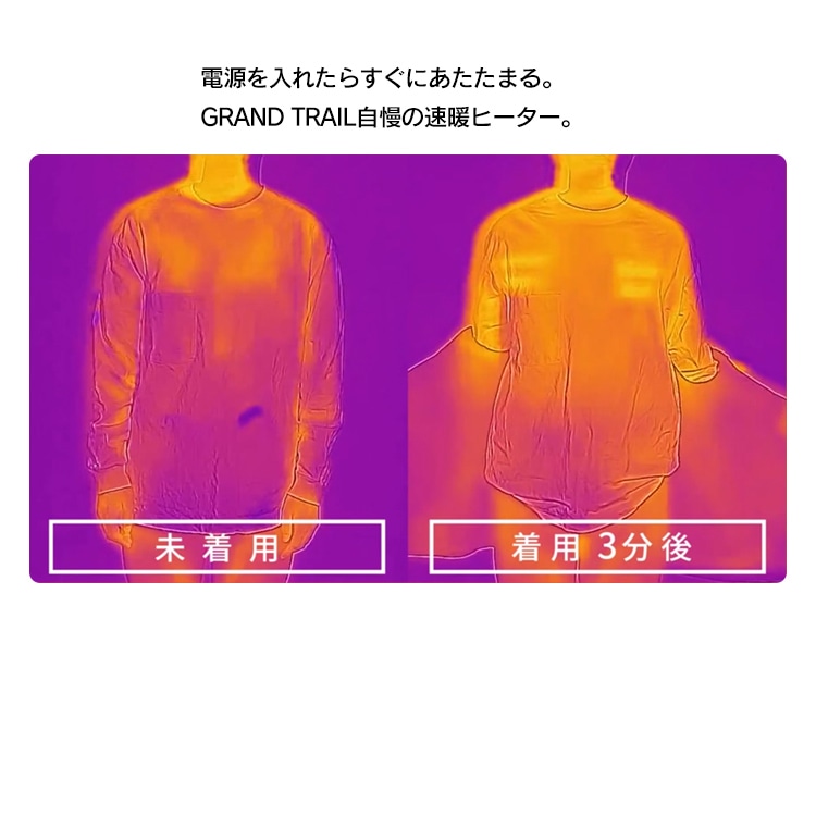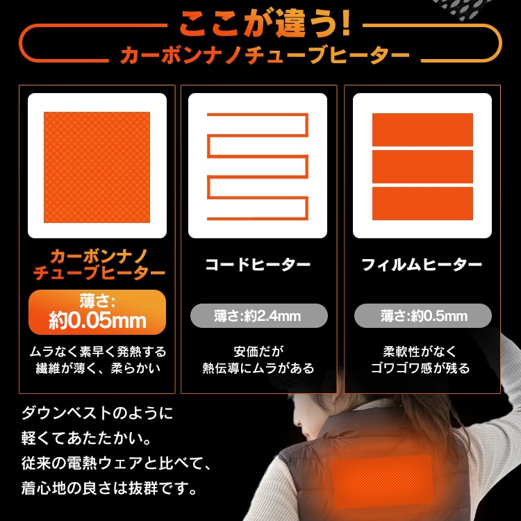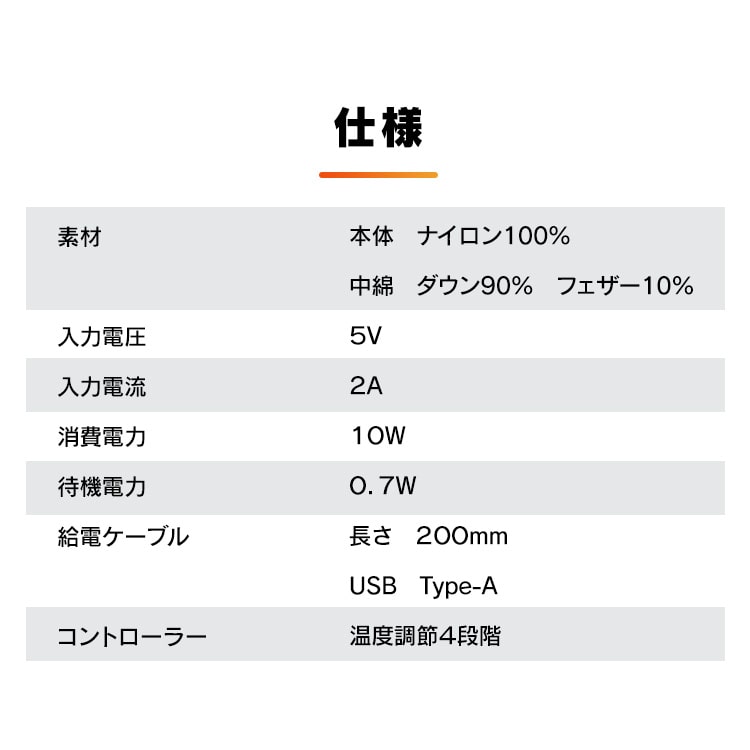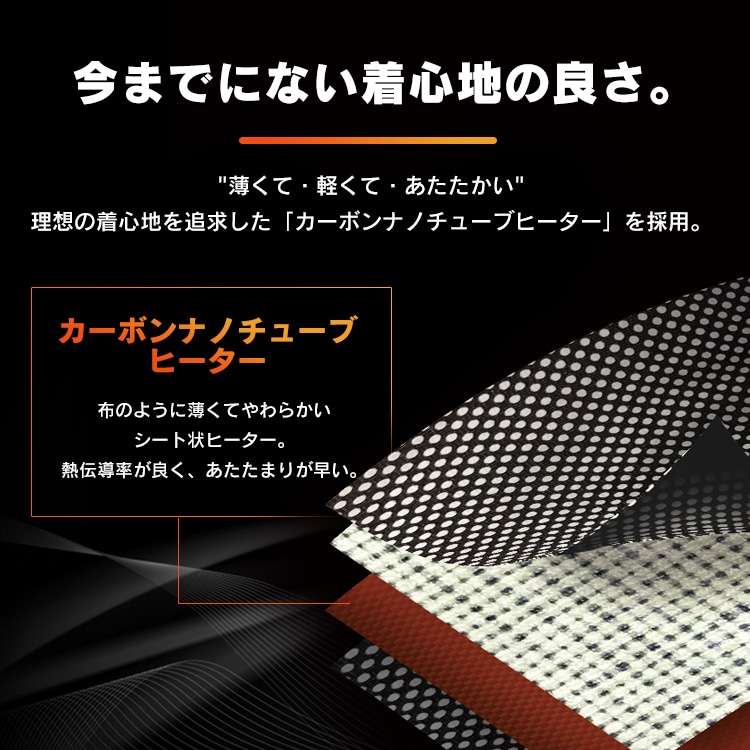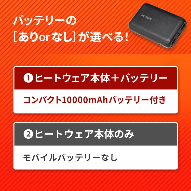 コンセントがない所でもあたたかいヒーター付きベストです。シート状のヒーターのため、着心地を損なわずに着用でき、外出時や普段着、寒い室内など様々なシーンで使用できます。[使い方]1.給電ケーブルとバッテリーを接続。2.コントローラーを押して温度を選択。(コントローラーを押すたびに、設定温度が4段階変わります)3.温度選択後すぐにあたたまります。※バッテリーは付属されていません。※市販の電圧5V・電流2A以上のモバイルバッテリーをご使用ください。