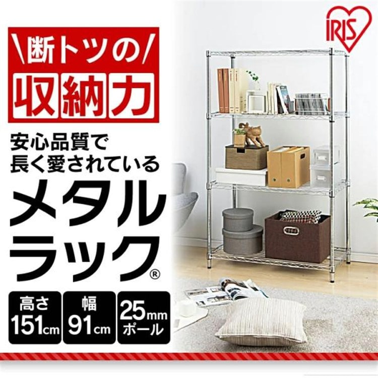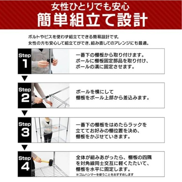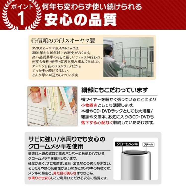●商品サイズ(cm)幅約91×奥行約46×高さ約151●重量約11.4kg●耐荷重全体300kg、棚板(1枚あたり)75kg●材質棚板・ポール:スチール(クロムメッキ)棚板固定部品:ABS樹脂アジャスター:スチール・ナイロン樹脂■キャスター取り付け時の静止時耐荷重は全体耐荷重で100kgまでとなっております。