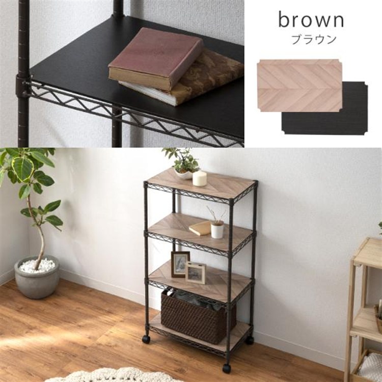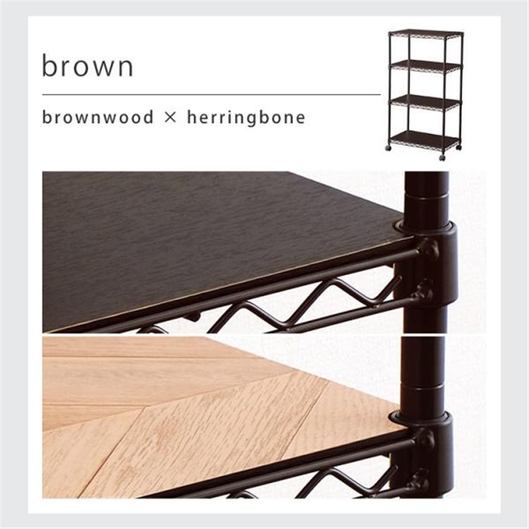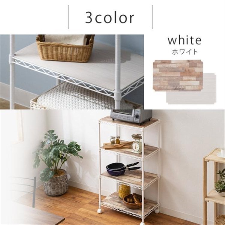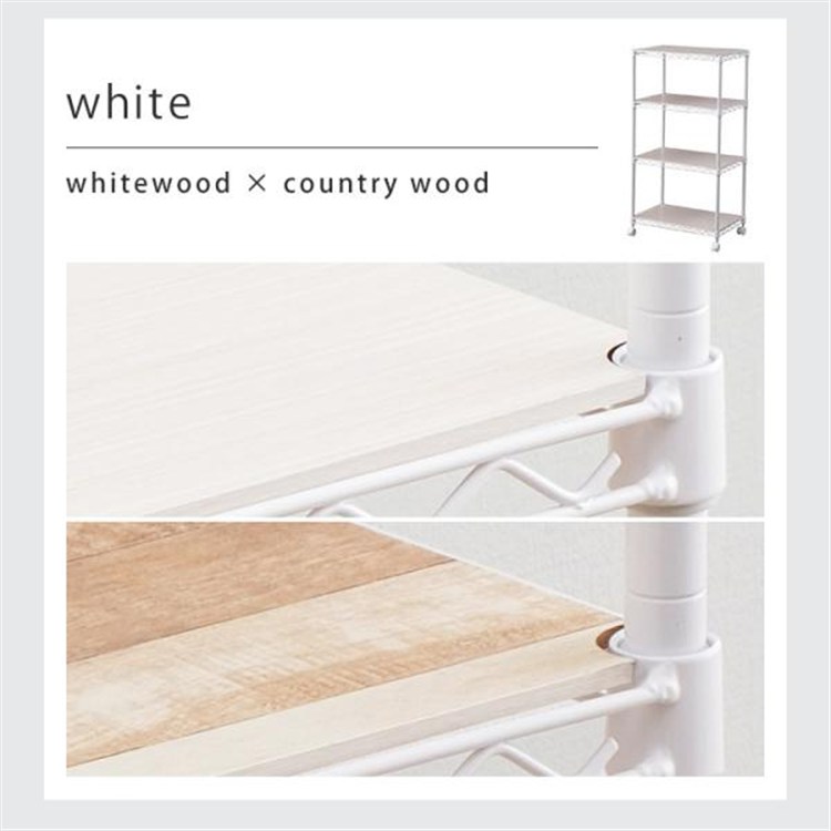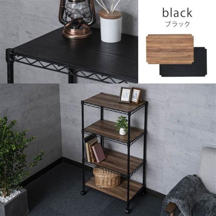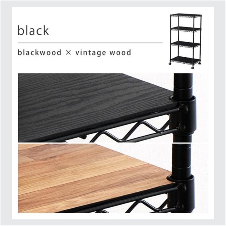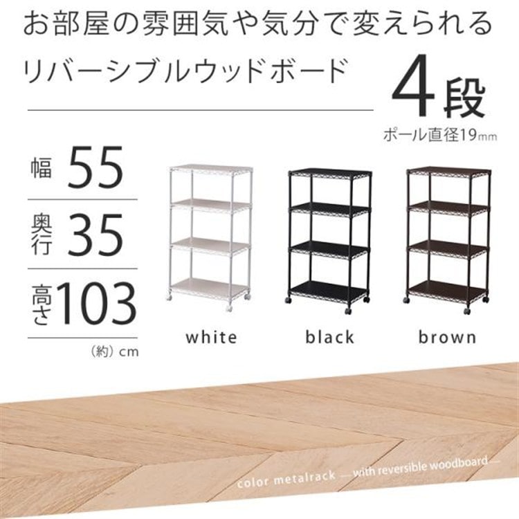 ★お客様組立★お部屋の雰囲気に合わせて選べる「リバーシブルウッドボート付き」マットカラーのメタルラック。ウッドボードを裏返すだけでイメージが変わります。◆4つのポイント1.高さ調節できる棚板ポールに入った2.5cm間隔の溝で棚板の高さが変えられるので、収納する物に合わせて、ムダなく最適なスペースで収納できます。2.キズ・サビに強い粉体塗装(パウダーコーティング)粉体塗装はガードレールや自動車塗装など、過酷な使用状況の塗装に多く利用されています。強く柔軟で寿命が長く、有機溶剤を使用していないため、人体にも環境にも優しいeco塗装です。3.余裕の耐荷重棚板1枚あたり:50kg全体:100kg4.移動に便利なキャスター付き2つのキャスターにはストッパーがついています。
